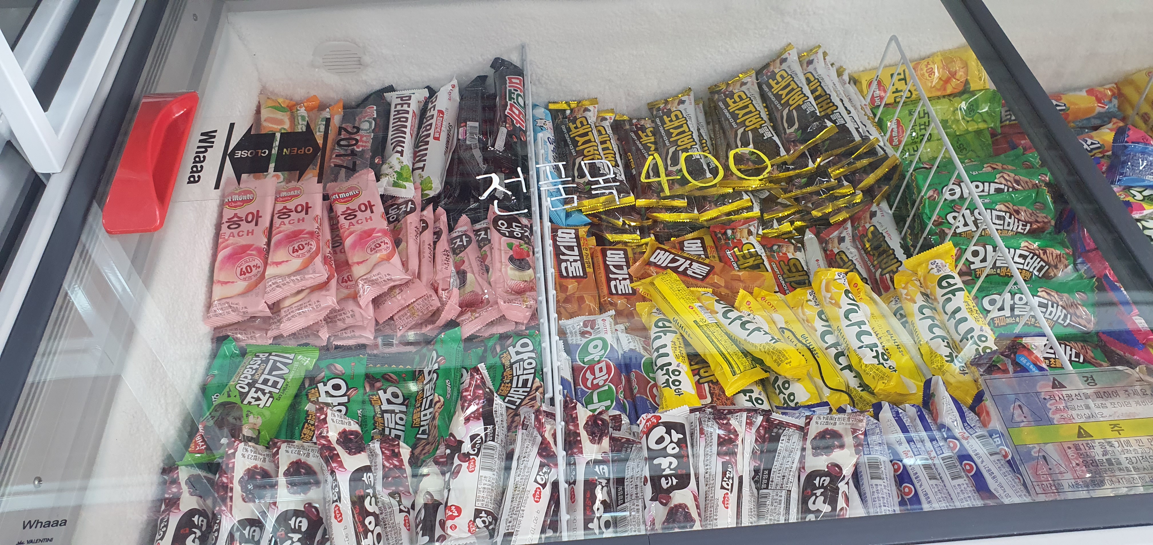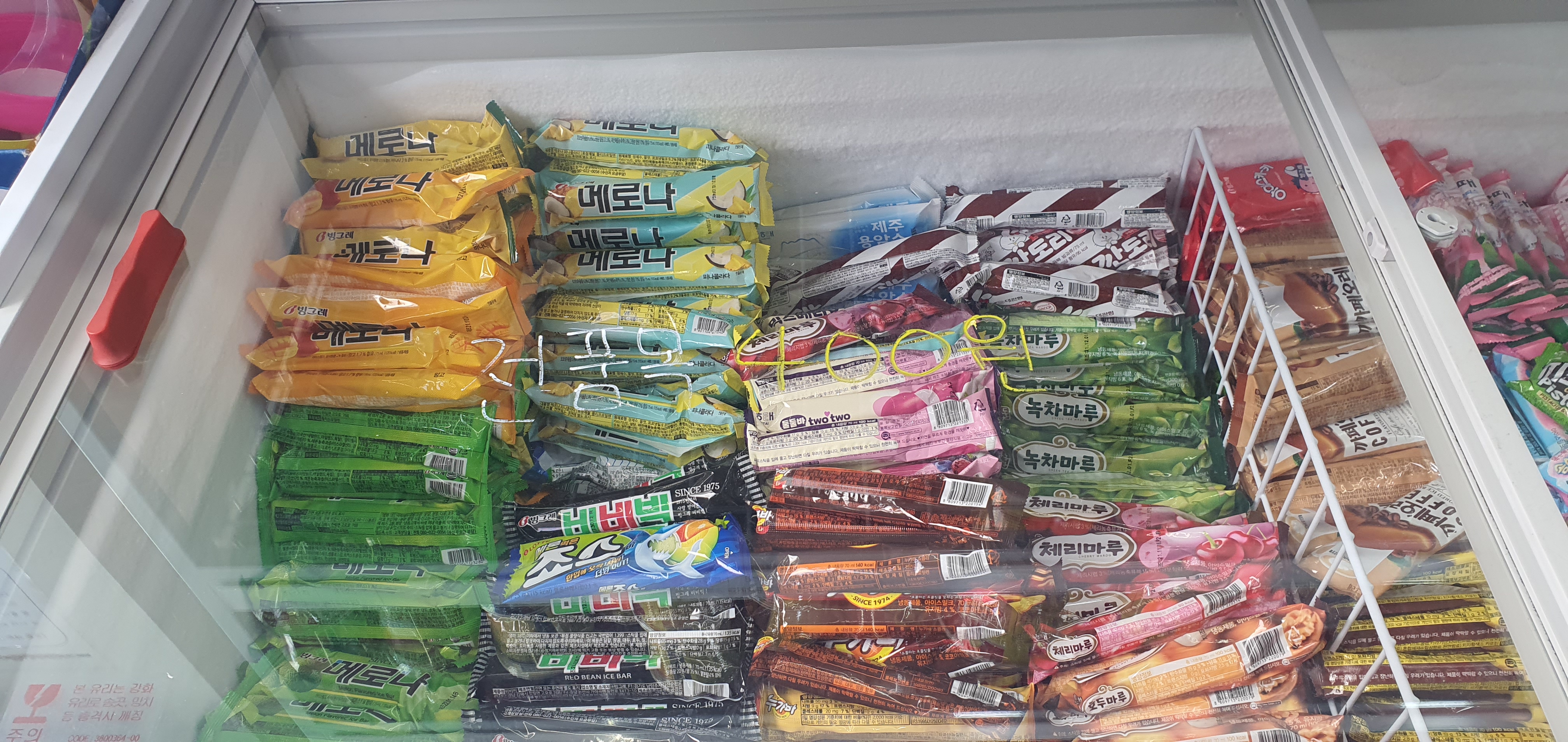 별난동네슈퍼25는 아이스크림 할인점 못지 않게 아이스크림류 가격이 저렴합니다. 당연히 종류도 정말 다양하게 있습니다. 바 형태 하드형 아이스크림은 400원이고 국화빵, 와플 등은 1,000원 정도 합니다. 집근처 아이스크림 전문점과 가격이 거의 동일한 것으로 예상됩니다.