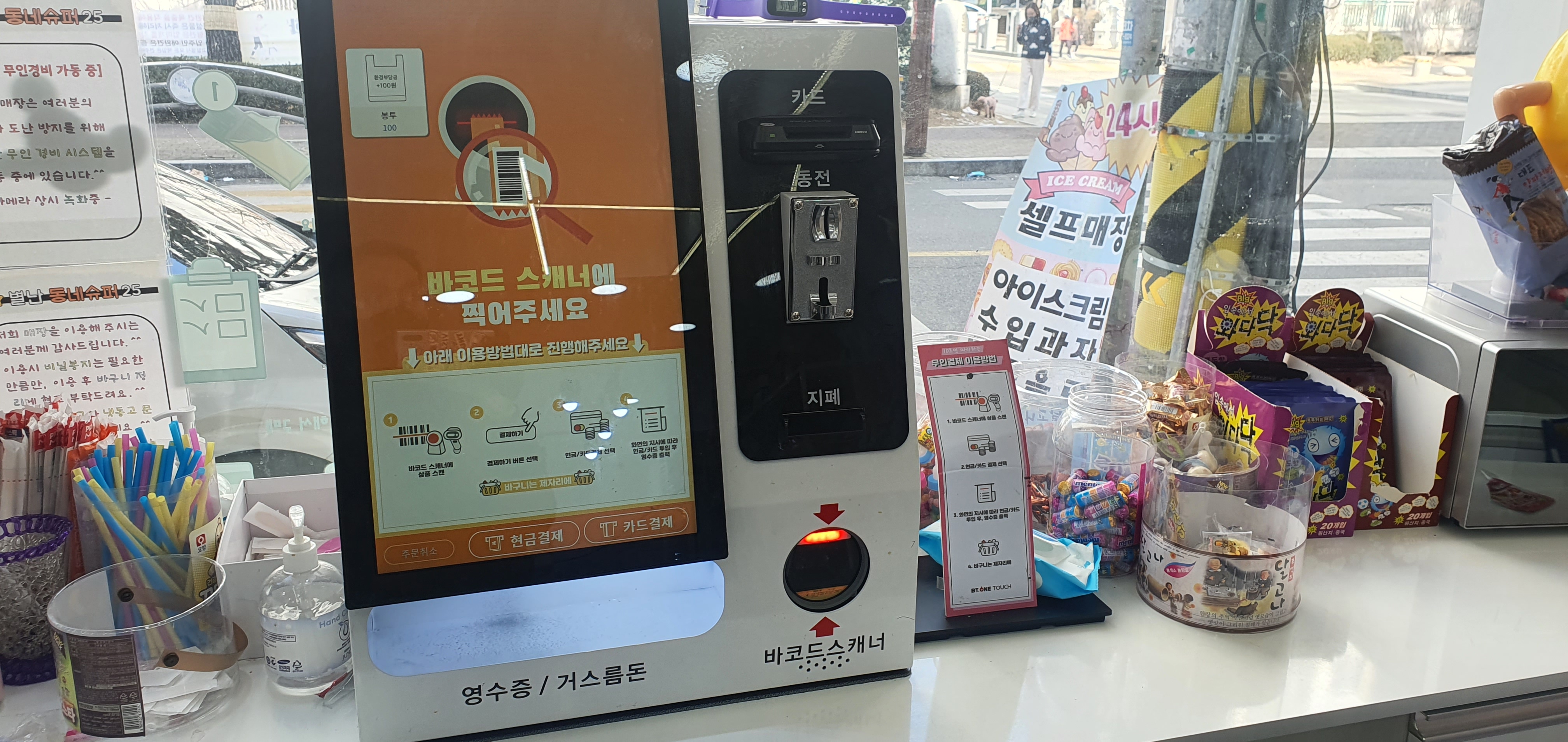부평산곡점 별난동네슈퍼25는 무인슈퍼라 출입구쪽에 무인포스기가 있습니다. 지폐, 동전, 카드 결제가 가능하고 구매 물품 바코드를 인식할 수 있는 센서와 큰 대형 화면 그리고 영수증과 거스름돈이 나오는 출구가 있습니다. 일반 슈퍼와 다르게 계산대가 차지하는 공간이 없어 10평 정도되어 보이는데 알차게 물품이 전시되어 있습니다.