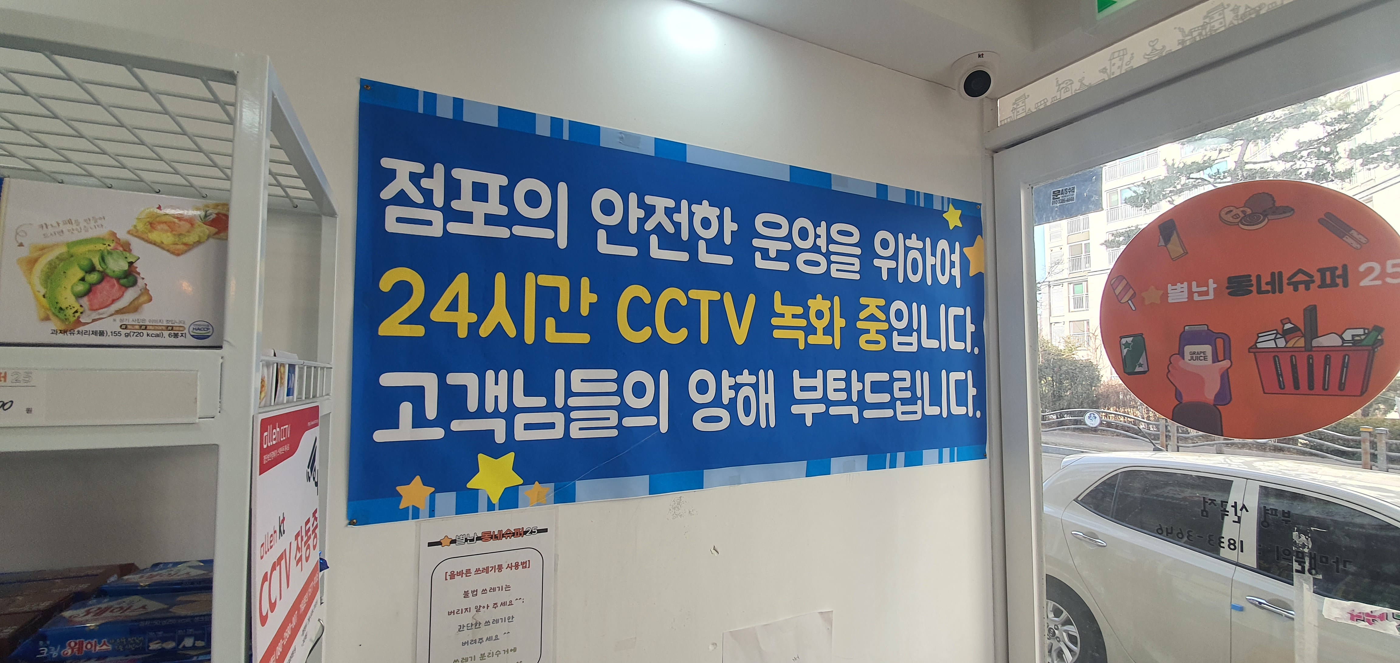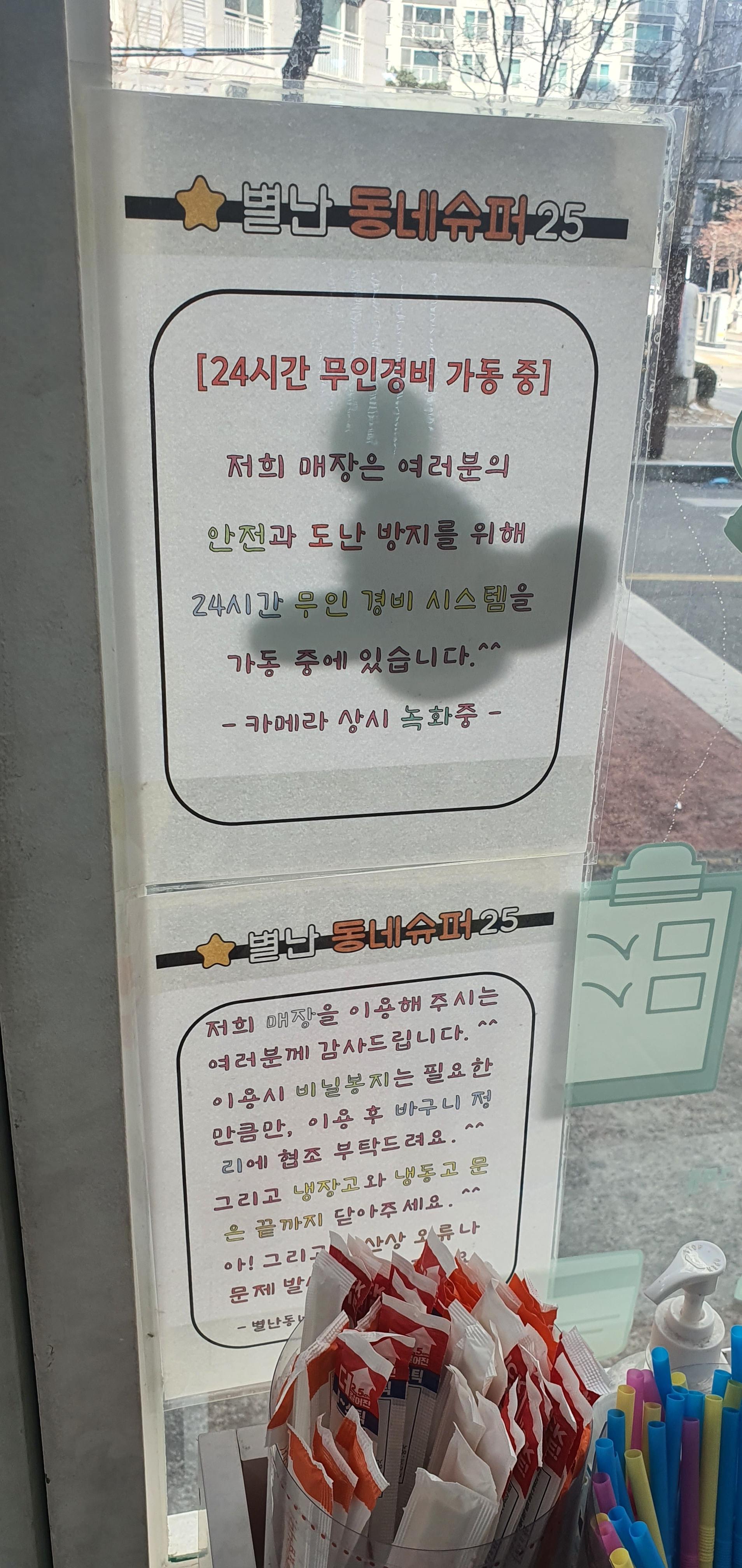무인슈퍼로 운영되는 별난동네슈퍼25 부평산곡점입니다. 인근 정육점을 가다가 아이들이 좋아하는 아이스크림을 구입을 위해 들어갔습니다. 요즘은 보안시스템이 좋아지고 무인포스로 결제하는 방법이 어렵지 않아서 무인상점이 점차적으로 증가하고 있습니다. 무인슈퍼 별난동네슈퍼25도 푸르지오, 꿈에그린 아파트 단지를 끼고 있는 상권에 작게 위치해 있어 많은 사람들이 찾을 것 같습니다. 무인슈퍼으로 운영하다 보니 입구를 들어서자 CCTV 녹화를 하고 있다는 안내문구가 가장 먼저 눈에 들어옵니다.