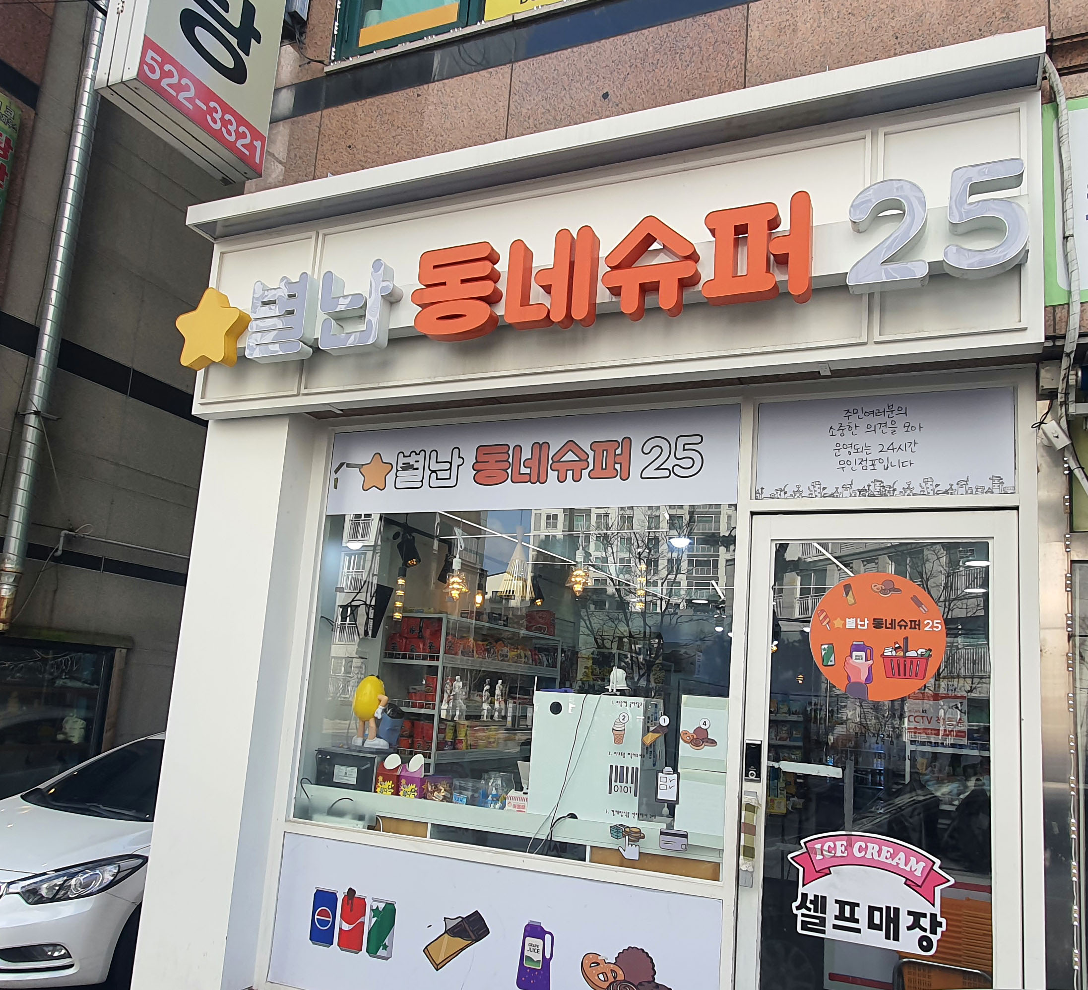 개인적으로 아이스크림 할인점보다 상점 공간을 활용면에서는 더욱 효율적인 것이 무인슈퍼 별난동네슈퍼25입니다. 아이스크림 쇼케이스가 아래에 있고 상단 선반에는 다양한 종류별 과자를 정리되어 있어습니다. 선반이 다소 상단에 있어 어린 아이들이 방문하여 이용하는데는 불편함이 있겠지만 성인들이 이용에는 큰 어려움이 없습니다.