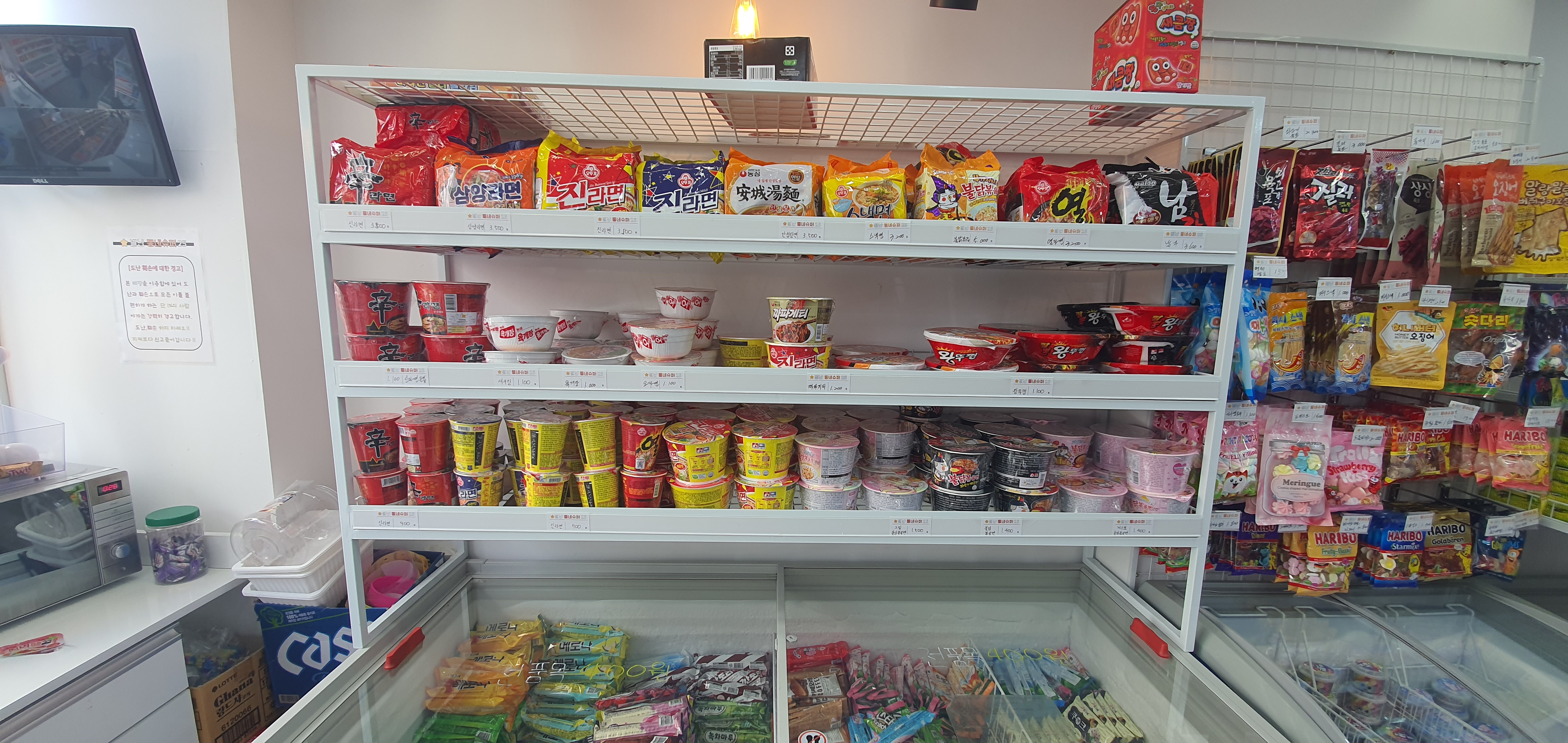 무인슈퍼라 물품을 많이들 찾는 순으로 잘 배열해야 방문하는 손님들이 불편함 없이 이용이 가능할 것 같습니다. 입구에서 가장 가까운 쪽에 야식으로 가장 많이 먹는 라면 선반이 보이고 그 옆으로는 음주시 많이먹는 마른안주가 배치되어 있습니다.