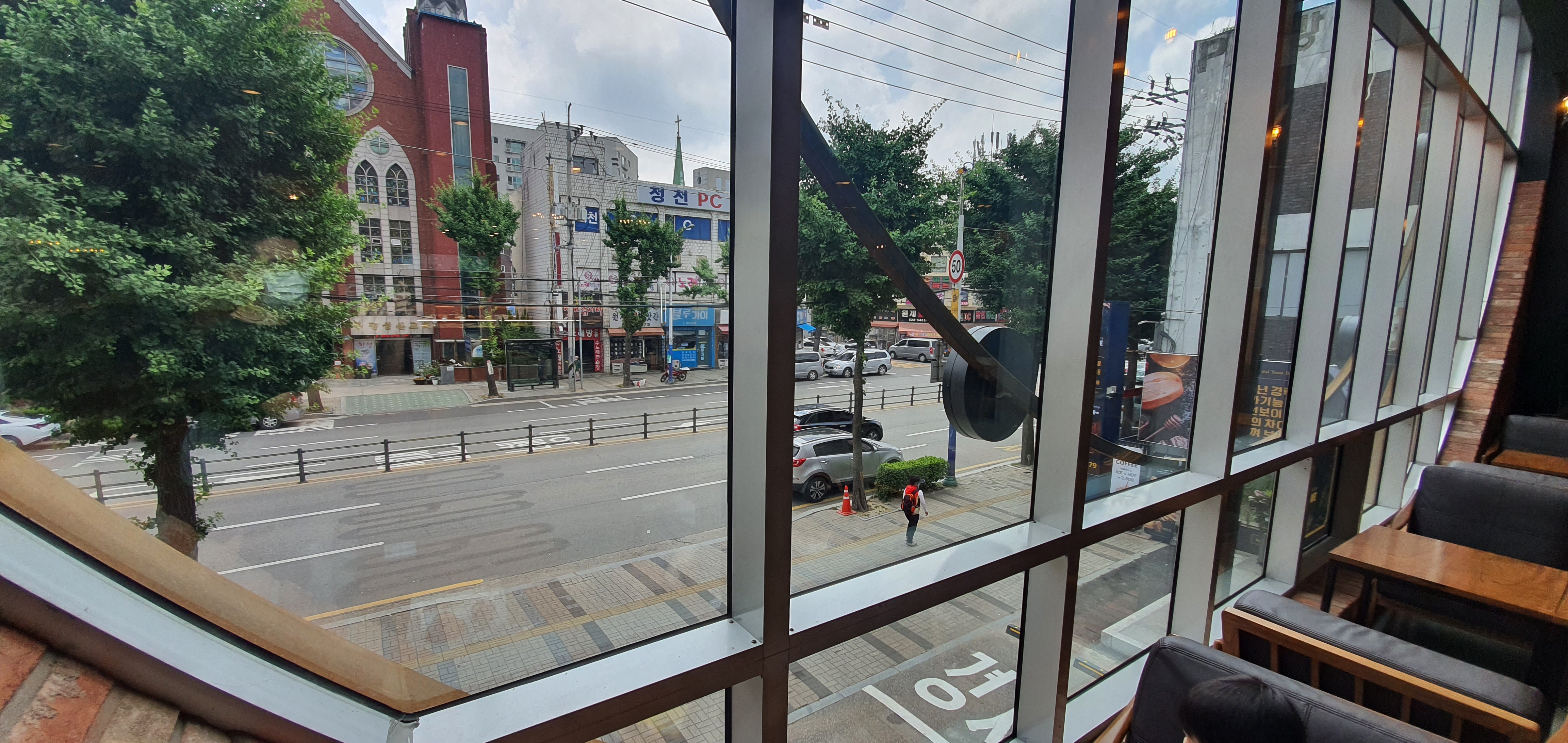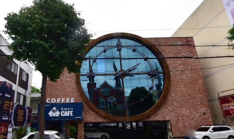 창가를 보면 마장로 도로가 보이는데 창문이 틀로 많이 구분되어 있어 개방감은 없습니다. 이 창문이 사실은 밖에서 보면 위 중앙에 사진처럼 대형시계입니다. 정말 시간이 가는 시계로 주변 분위기로 보았을 때 가장 돋보이는 익스테리어입니다. 사실 주변에 일반 음식점이 많고 카페가 위치하기에는 썩 어울리지 않습니다. 대형 시계를 랜드마크로 하여 빵카페지만 건물 외형에서 주목도를 높이기 위해서 많은 신경을 쓴 것이 분명합니다.