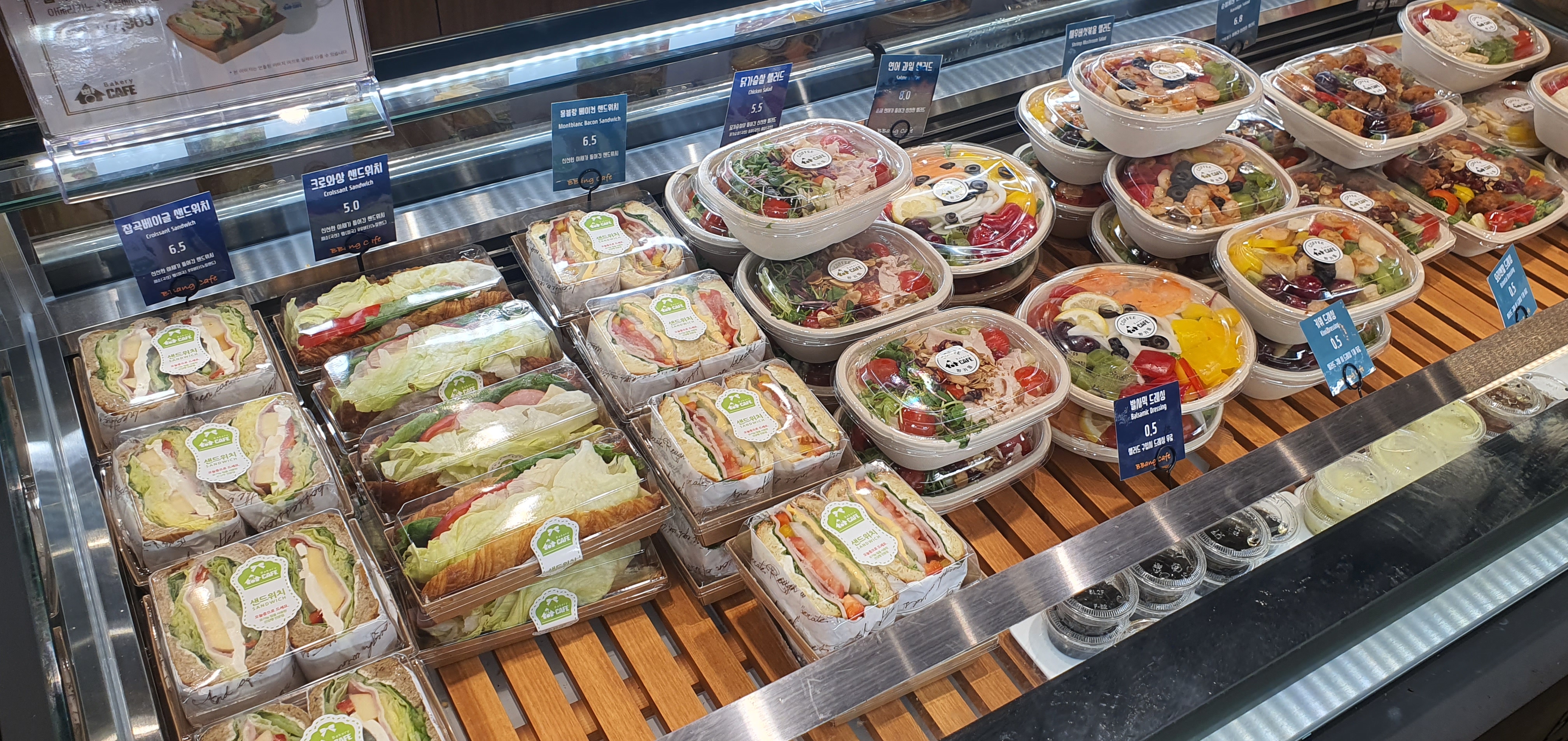 빵카페는 넓은 공간을 자랑하는 만큼 빵종류가 다양하기도 하지만 양도 정말 많습니다. 특히 아메리카노와 잘 어울리는 달달한 컵케이크가 있는데 컵케이크라고 해서 크기가 작지 않습니다. 컵케이크는 모두 먹음직스럽게 과일이 올라가 있으며 딸기, 초코생크림, 블루베리, 망고, 티라미슈 등이 있습니다. 조각 케이크 크기가 일반 카페보다 커 보입니다. 베이커리 카페 빵카페는 시각적으로 식욕을 복돋우워 구매력을 높이는 전략인가 봅니다. 샌드위치와 샐러드가 포장단위도 커 보이고 다양합니다.