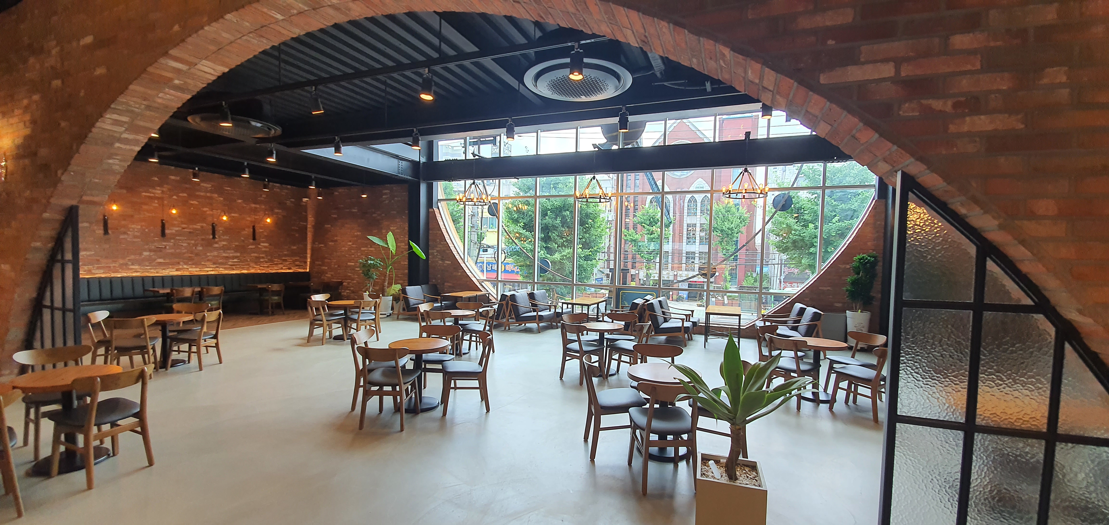인천 부평 청천동에 위치한 베이커리 카페 빵카페는 넓은 공간을 자랑합니다. 외부에서 보았을 때는 그렇게 넓게 보이지 않는데 안에 들어가 보면 방문객 단위로 혼잡함이 느껴지지 않도록 테이블 간격도 충분히 여유가 있습니다. 위 좌측 사진을 보면 단체 방문객을 위한 10인용 테이블도 있고 벽면에는 쇼파형 좌석, 홀 중앙에는 원형 테이블 등으로 구성되어 있습니다. 개인적으로 실내 인테리어 부분에서 아치형 벽이 중간 정도에 있어서 창가를 바라보면 정말 예쁩니다. 사람들이 없어서인지 외국에 온듯한 느낌이 듭니다.