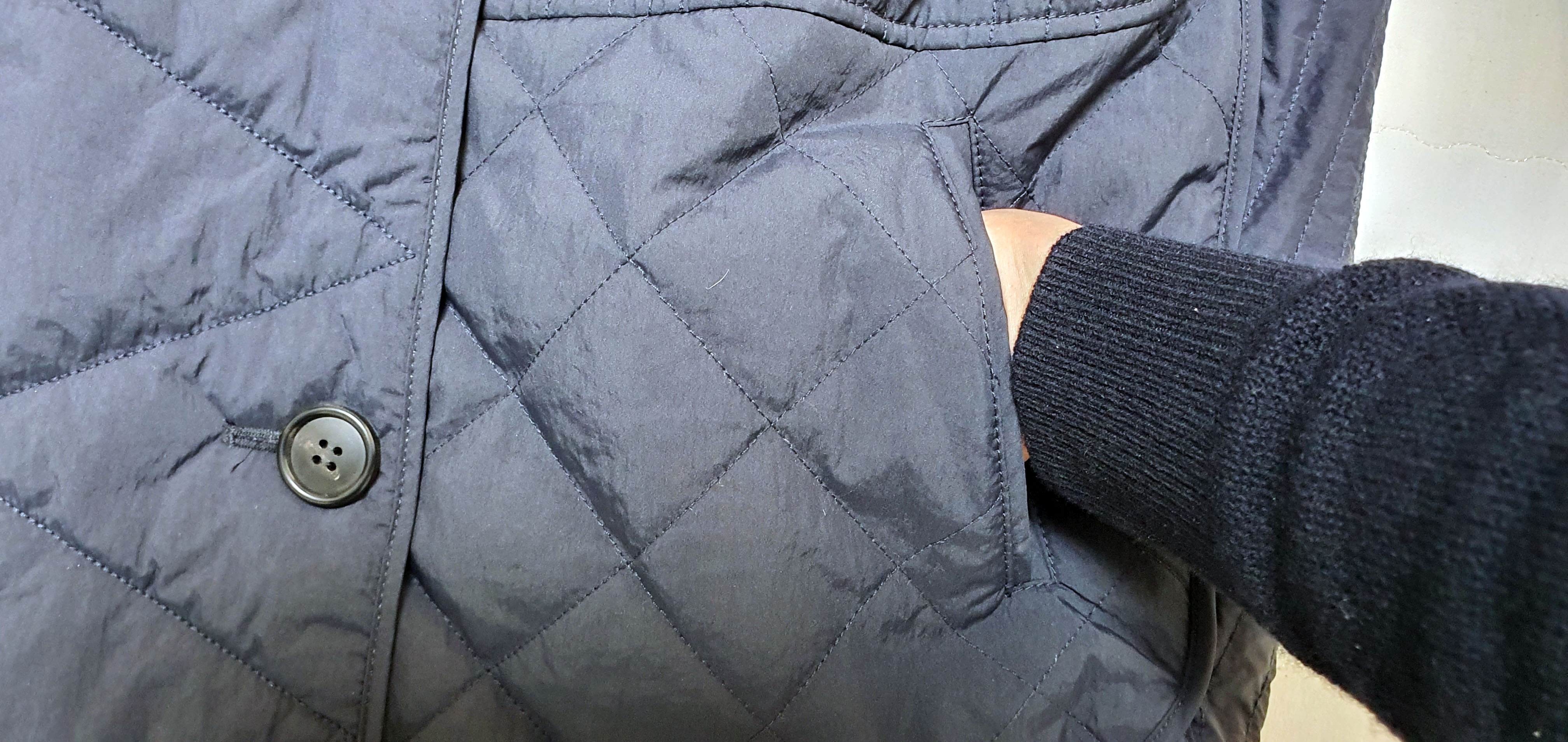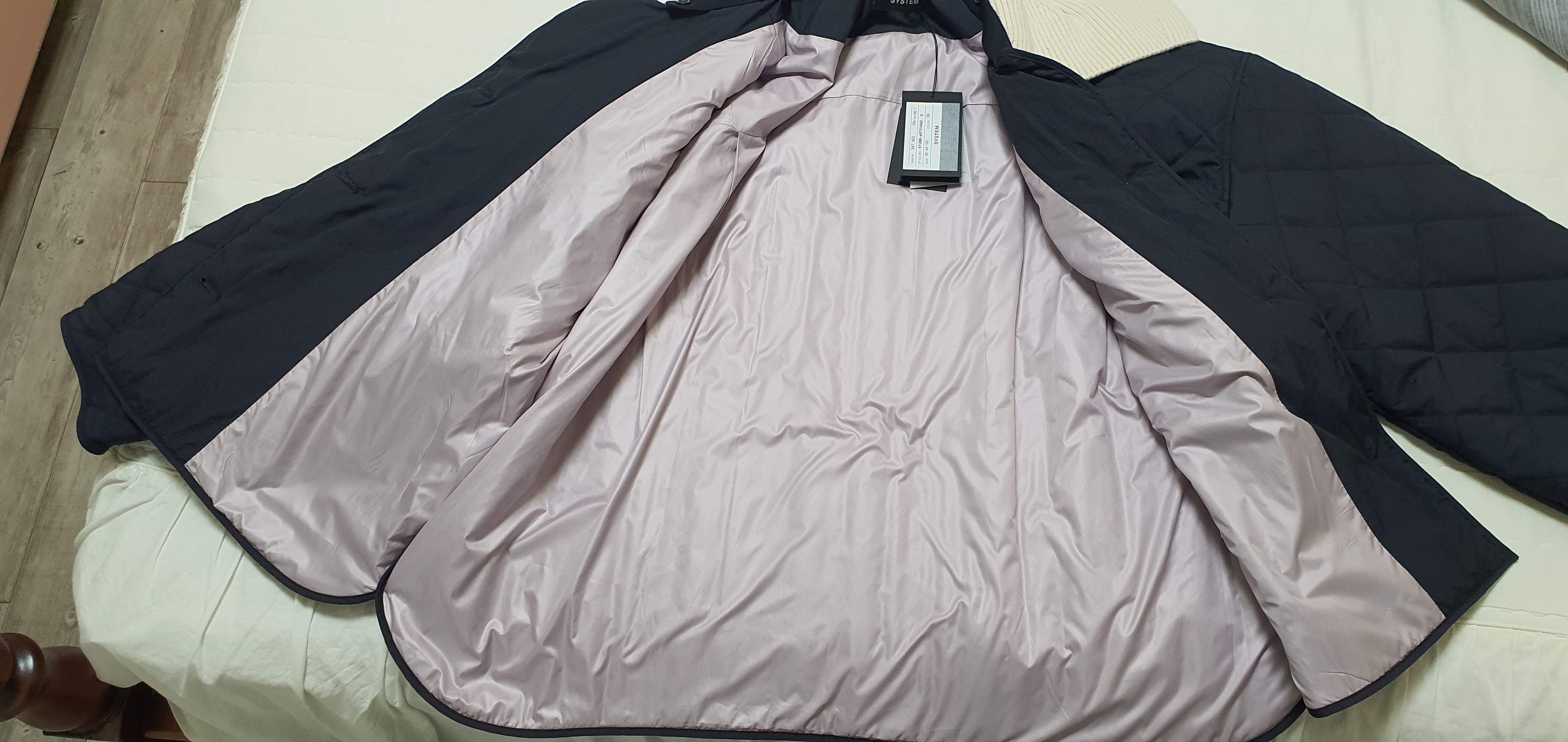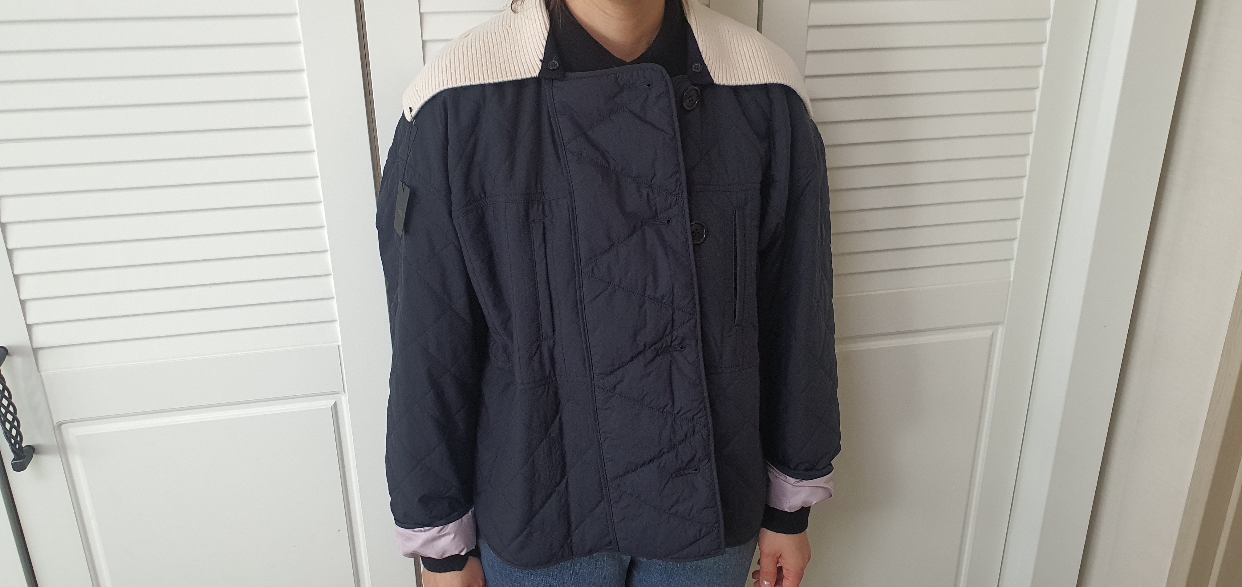 퀼팅 패턴의 경우 전체적으로 일률적인 패턴을 넣지 않고 앞판에는 부분별로 3가지 패턴으로 되어 있어 촌스럽지 않고 스타일리쉬한 느낌입니다. 등판은 안소매보다 윗부분에서 시작하여 떨어지는 세로패턴 퀼팅이 길어 보이는 효과를 줍니다. 저는 개인적으로 앞판 단추 크기가 500원 동전보다 약간 작은 듯 적당하며 대각선으로 감각있게 패턴을 달리한 부분에서 많은 점수를 주고 싶습니다.