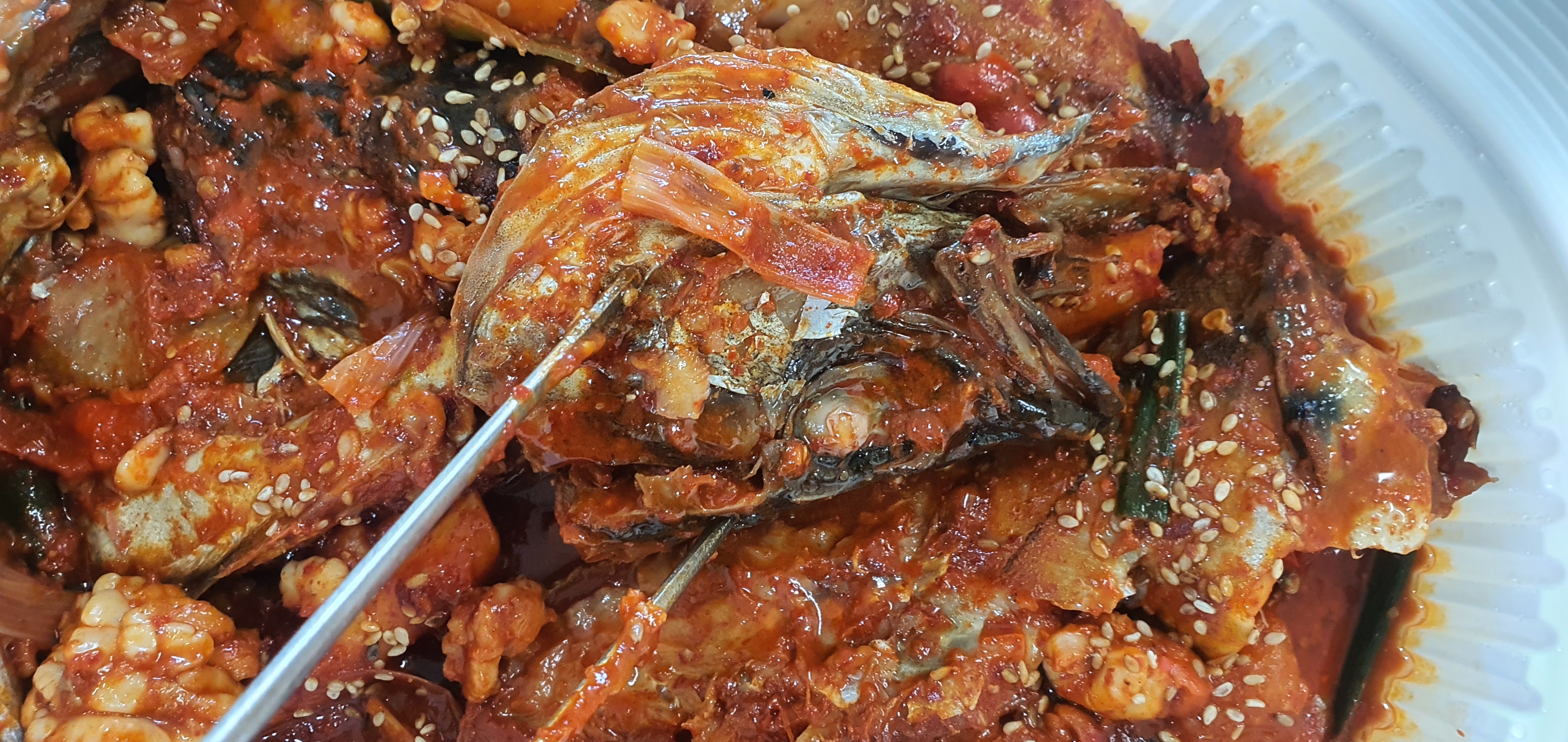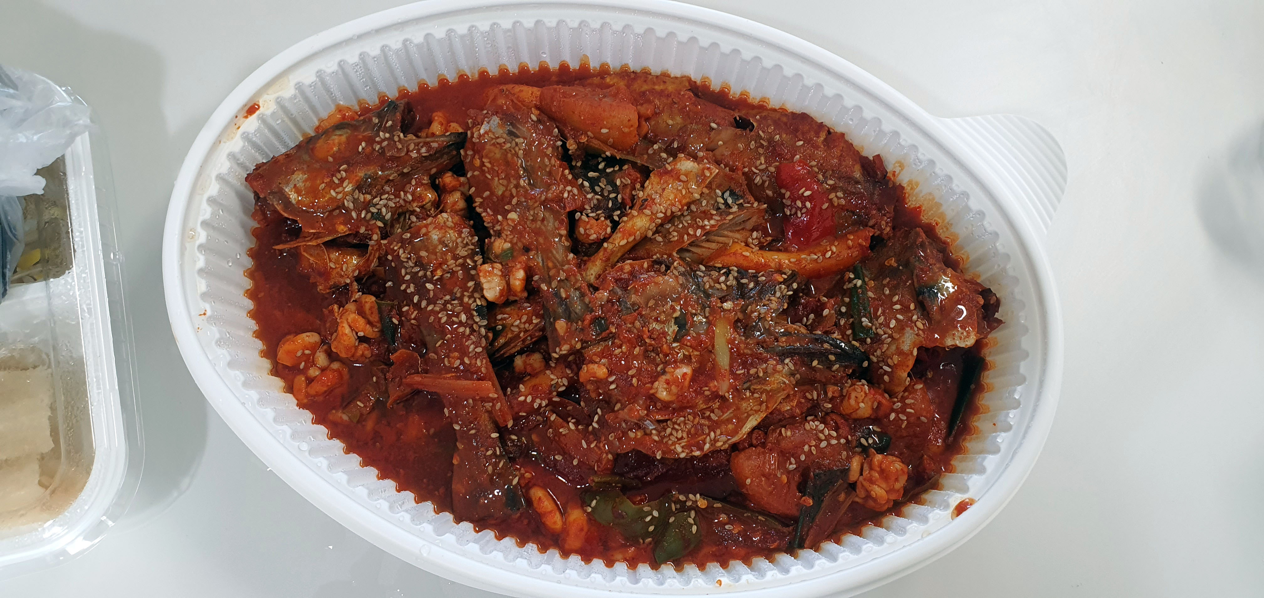 '소' 사이즈는 메뉴표에 안내되어 있는대로 성인 2 ~ 3인이 드시면 알맞은 사이즈입니다. 명태 한마리가 고스란이 들어가서 조리된 것인지 빨간 매콤명태조림 중에 머리 부분이 가장 먼저 눈에 띄었습니다. 머리 부분은 어떻게 먹을 줄을 몰라서 일단 분리했습니다.