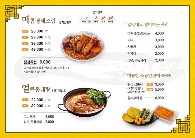 2대맛태 대표적인 메뉴는 매콤명태조림입니다. 명태조림이 매운 음식이기는 하지만 인천 서구 맛집 2대맛태는 메뉴표에 안내된 것과 같이 맵기를 선택할 수 있습니다. 저는 개인적으로 매운 음식을 그렇게 좋아하진 않아 가장 맵지 않은 보통(기본)을 선택했습니다. 그리고 사이즈도 대, 중, 소 3가지 이외에 가장 작은 사이즈인 '미소' 사이즈가 있습니다. '미소'에 앞 '미'자가 한자로 '작을 미'로 '소'보다 더 작다는 의미일 것 같습니다. '소' 사이즈와 사리로 '고니'를 선택하여 구매했습니다. 잠깐 '고니'를 얘기하면 '이리'라고도 하는데 알탕에서 자주 볼 수 있는 뇌처럼 보이는 꼬불꼬불한 식재료로 명태나 대구 수컷 생식소입니다.