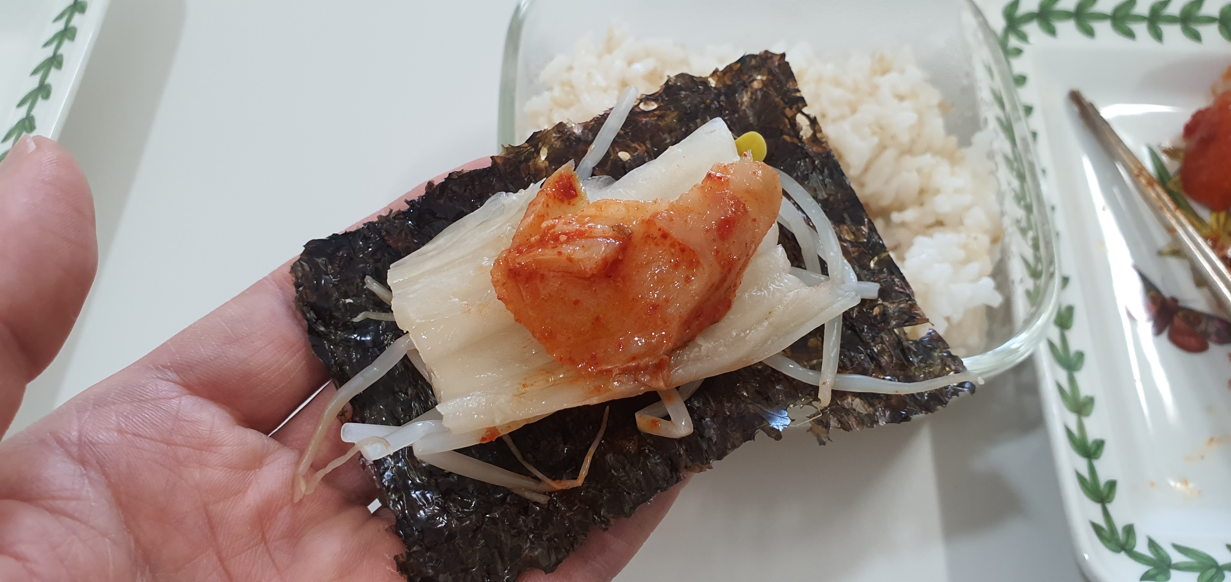 매콤한 명태조림과 잘 어울리는 콩나물과 백김치 그리고 고소한 김입니다. 제가 백김치라고 작성하였는데 백김치보다는 약간 신맛이 많이 납니다. 쉽게 설명드리면 매우 잘익은 김장김치를 물로 씻은 듯한 느낌과 비슷합니다. 그런데 그것 보다는 빨간 양념이 배어 있지 않아 나름 인천 서구 맛집 2대맛태만의 노하우가 있을 것이라 생각됩니다. 김은 봉지로 쌓여 있어서 양을 예상하기가 쉽지 않았는데 봉지에서 꺼내어 보니 매우 많습니다. '소' 사이즈 매콤명태조림을 다 먹고도 남을 양입니다.