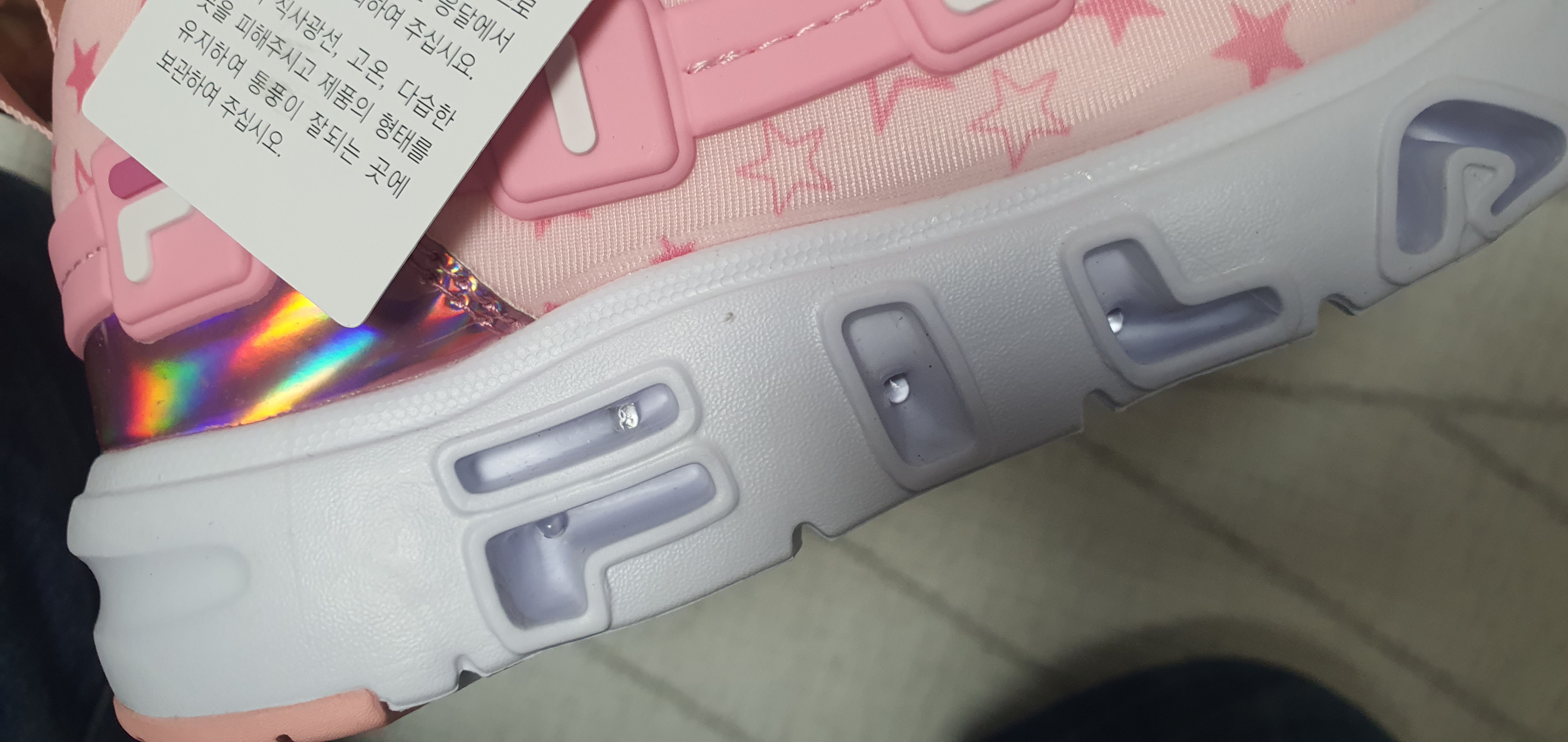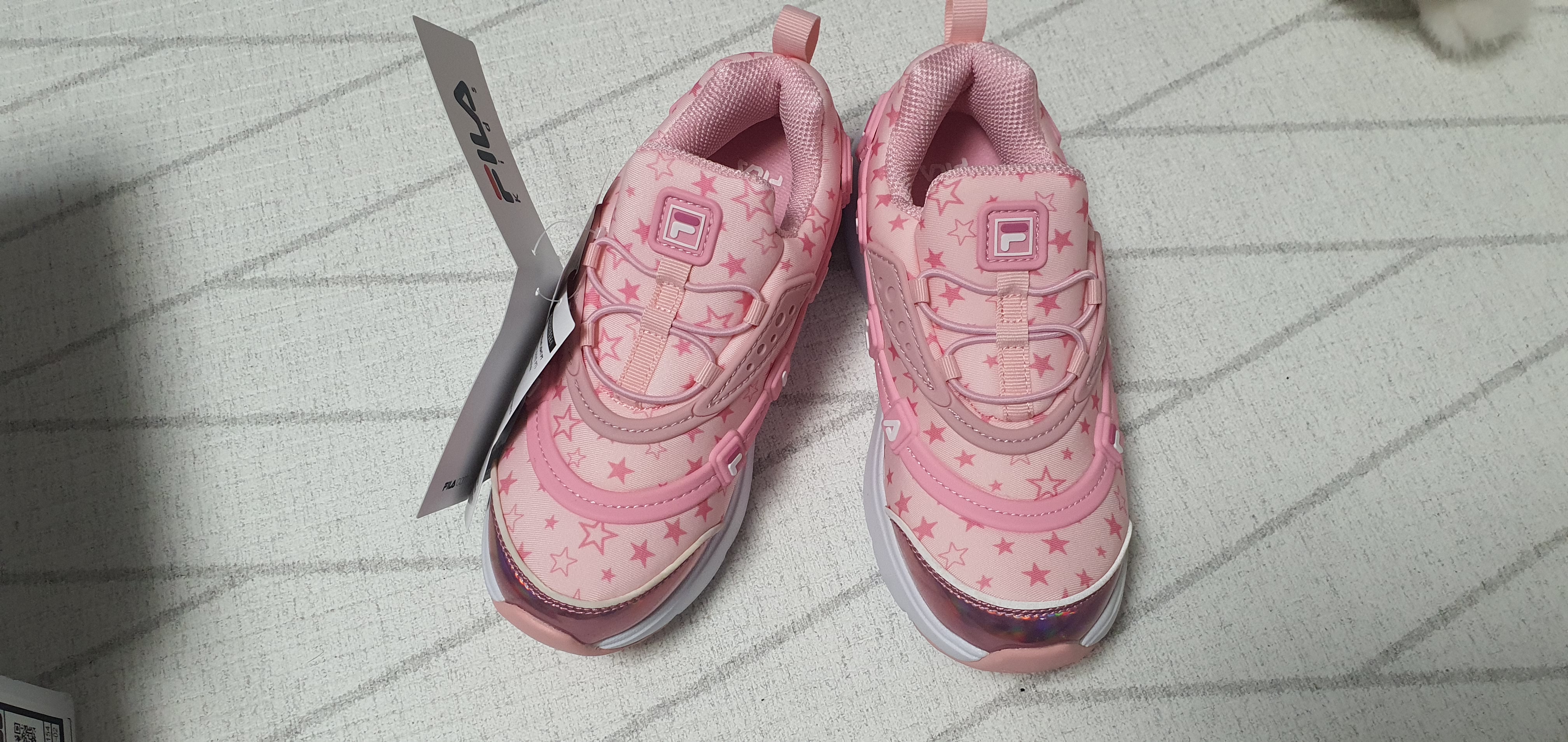 여아용 휠라운동화 꾸미라이트 포스팅 이전에 남아용 꾸미라이트를 포스팅했습니다. 여아용 색은 매우 눈에 띄는 핑크색 계열인데 배색 면에서 남아용 꾸미라이트가 더욱 눈에 들어옵니다. 배색만 다르지 디자인은 동일합니다. 꾸미라이트 특징인 옆라인과 뱀프 그리고 힐탑에 이르기까지 라인이며 휠라운동화 꾸미라이트에 전반에 새겨진 별모양 등 모든 것이 동일합니다. 별무늬의 경우 남아용 꾸미라이트는 그렇게 눈에 띄지 않은 반면 여아용 꾸미라이트는 무늬가 바로 눈에 들어옵니다.