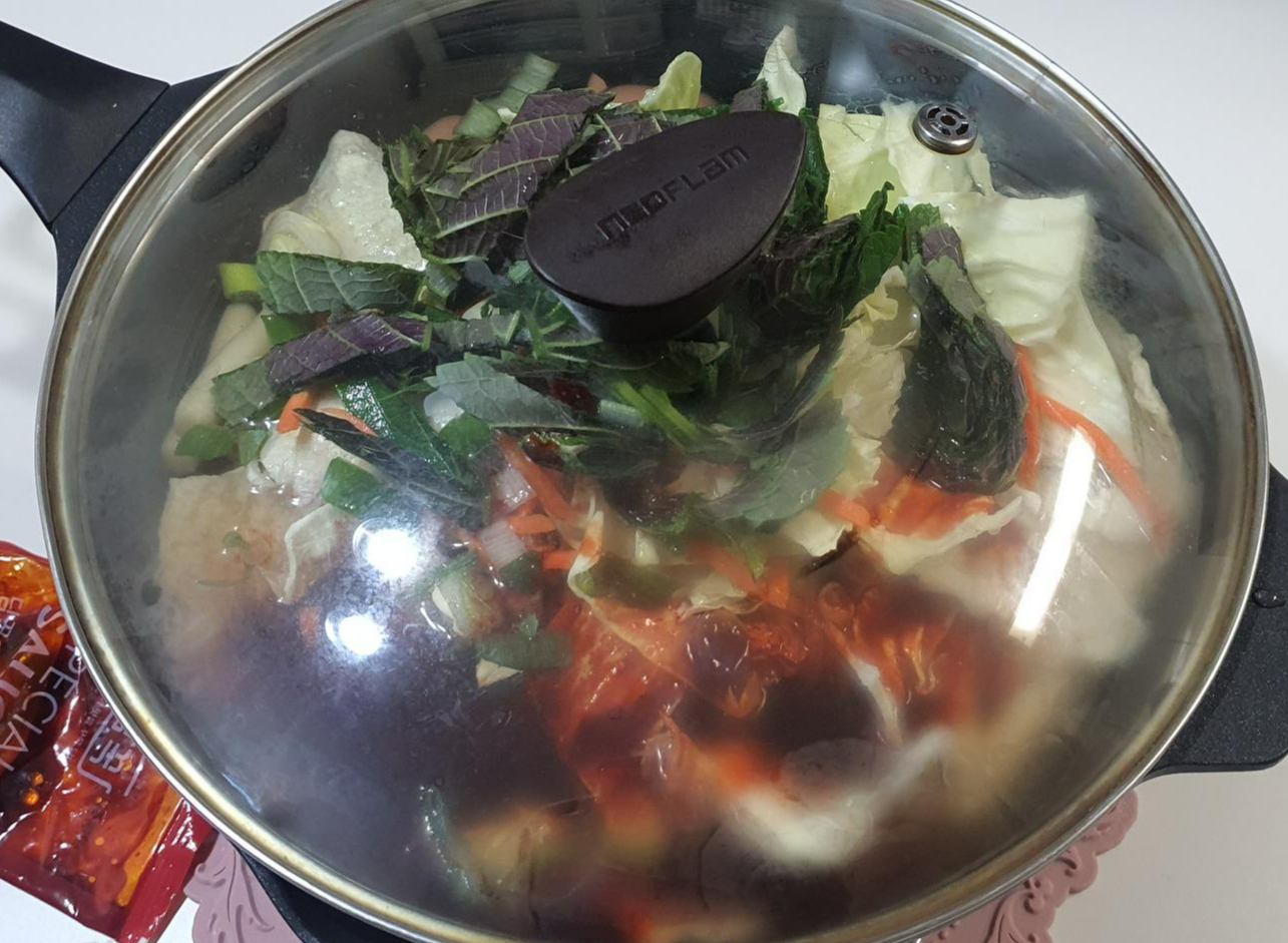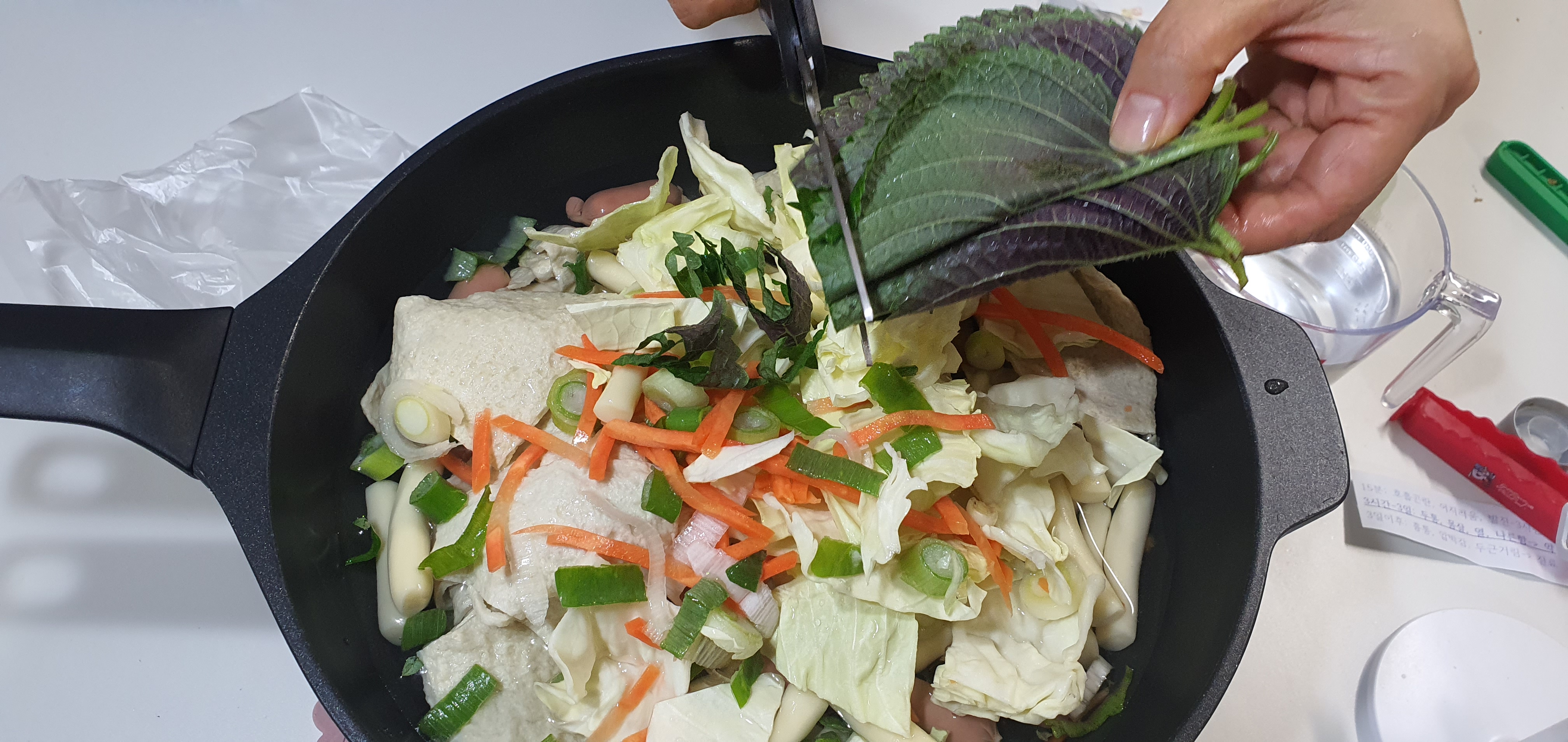 한번 더 씻은 야채를 냄비어 넣은후 깻잎은 조리용 가위를 이용하여 잘게 잘랐습니다. 물과 야채까지 넣으니 양이 상당히 많아 보입니다. 분류별로 보았을 때와 다르게 3인분 충분해 보입니다.