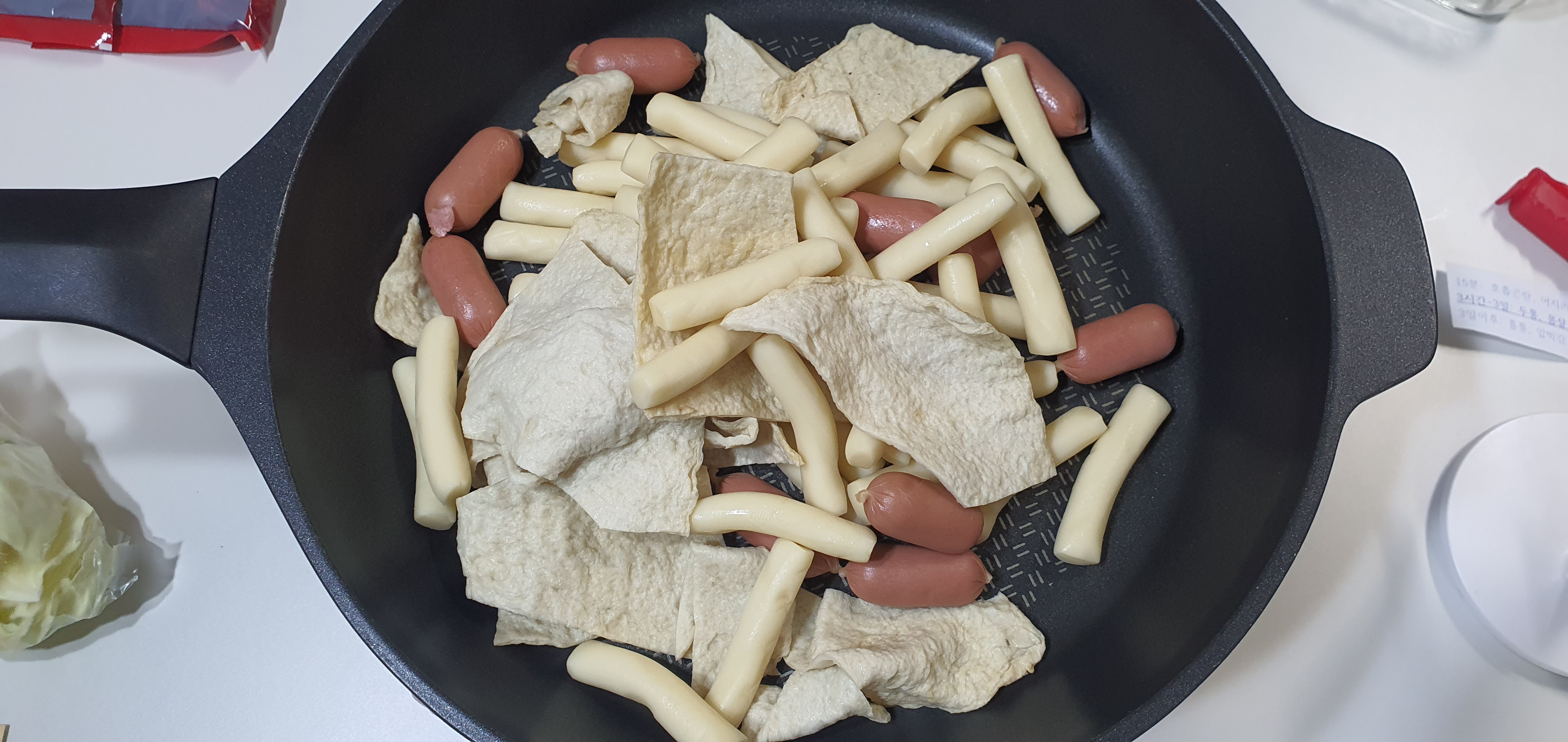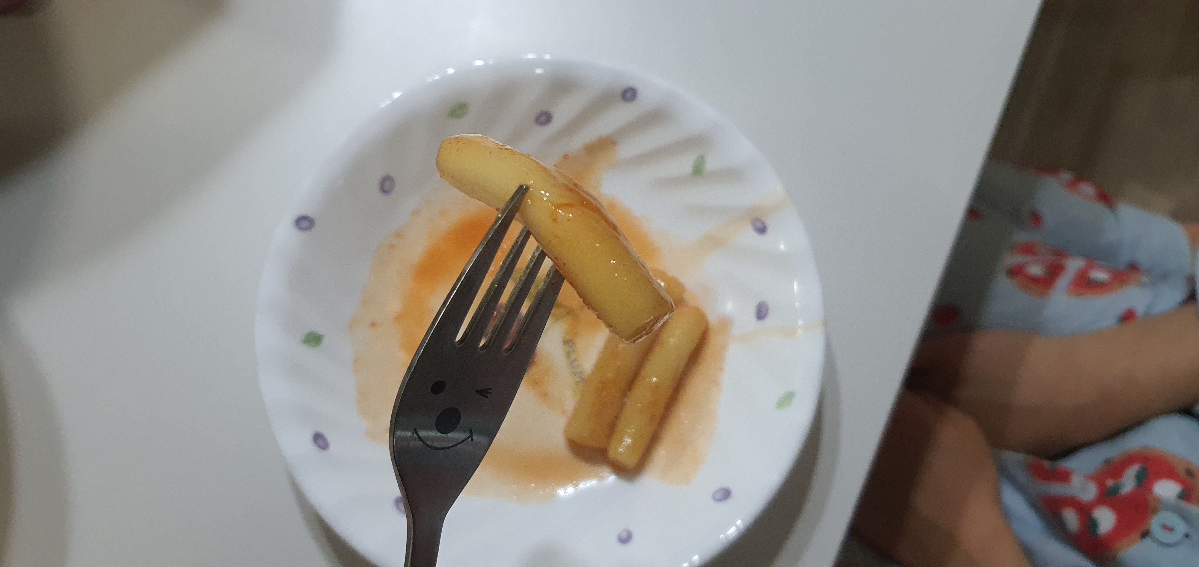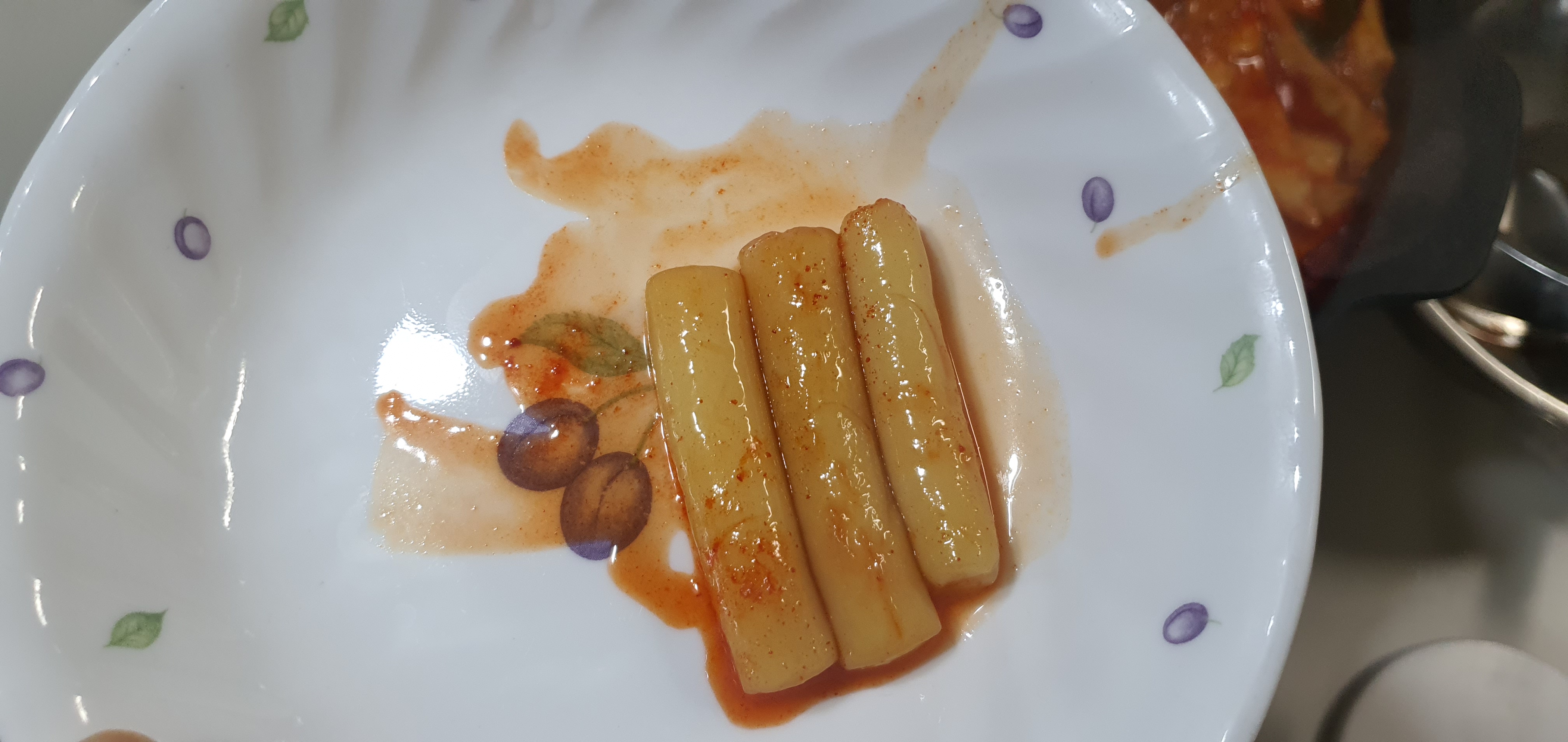 아이들 먼저 먹이기 위해 덜 졸여졌을 때 떡를 3개만 떴습니다. 조리 안내서는 '쫀득쫀득'이라는 표현을 하였는데 개인적으로 그것보다 '야들야들'하면서 말랑한 느낌이 더욱 와닿습니다. 쌀떡은 쫄깃한 맛이 더하지만 밀떡은 특유의 말캉한 맛으로 차이가 분명히 있습니다.
