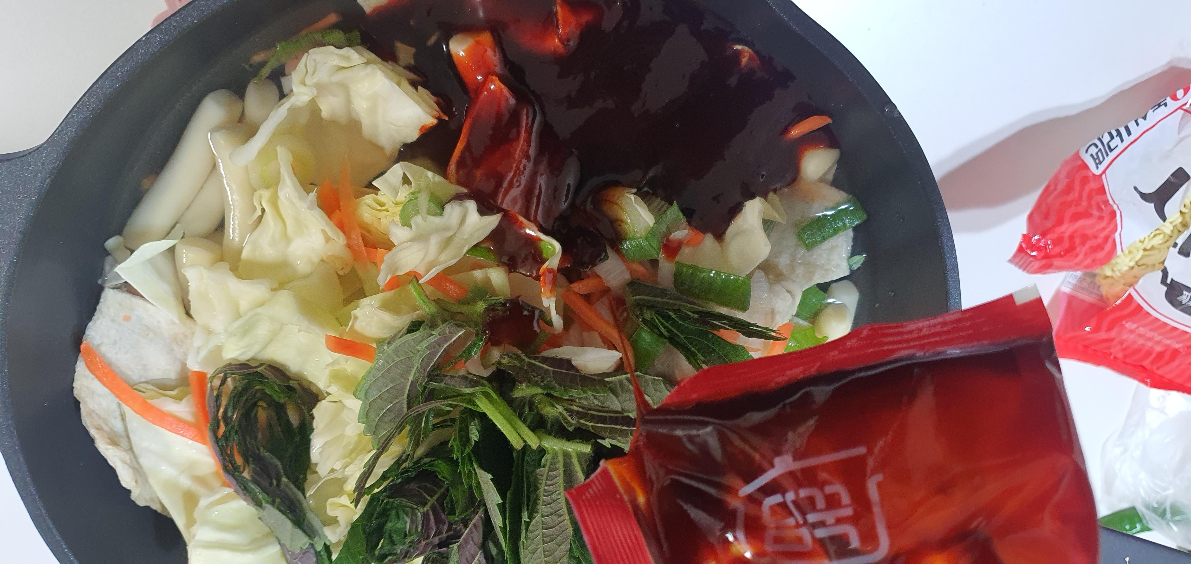 담꾹 즉석떡볶이는 비법소스가 2봉지 들어가 있습니다. 비법소스를 재료가 들어간 냄비에 넣어보니 소스가 예상보다 묽어 보이는데 진하며 빨갛습니다. 시각적으로도 매워 보입니다. 소스가 묽어서 물에 빠르게 희석되고 즉석떡볶이 재료에 소스가 잘 배일 것 같습니다.