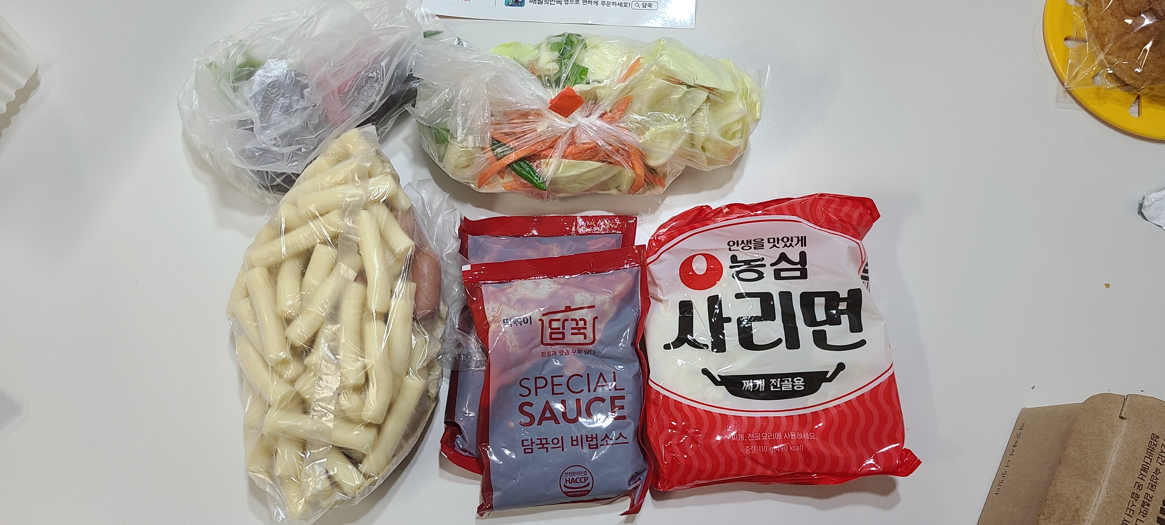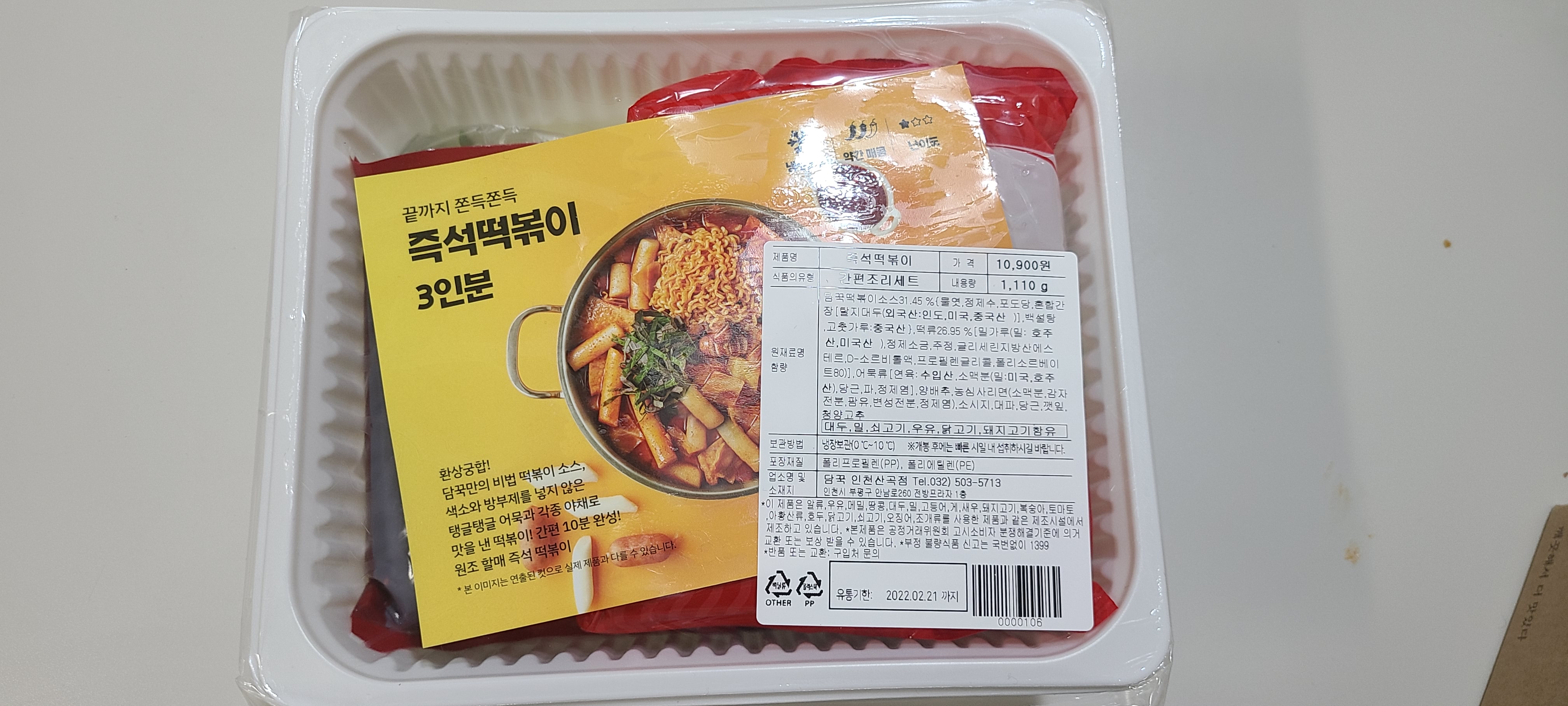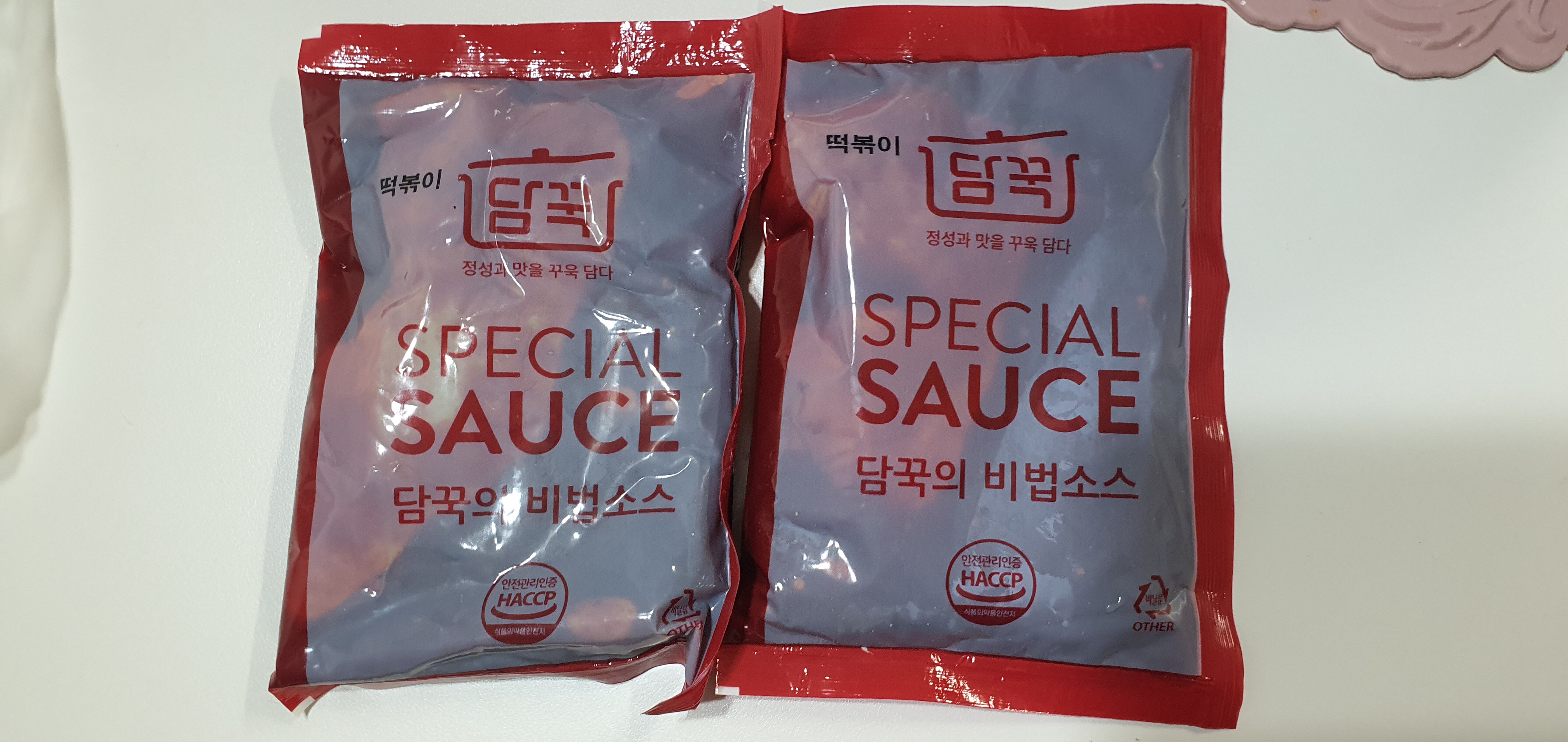 담꾹 매장 사진에서도 보셨겠지만 보통 음식점에서 음식 포장시 사용하는 네모난 대형 플라스틱에 위 우측사진 즉석떡볶이 내용물이 전부 들어가 있습니다. 안에는 내용물별로 구분하여 소포장이 되어 있습니다. 떡볶이, 비법소스, 라면사리, 야채 등이며 즉석떡볶이며 양은 3인분입니다. 재료들이 분류되어 있어서 그런지 3인분 양처럼 보이지 않았습니다.