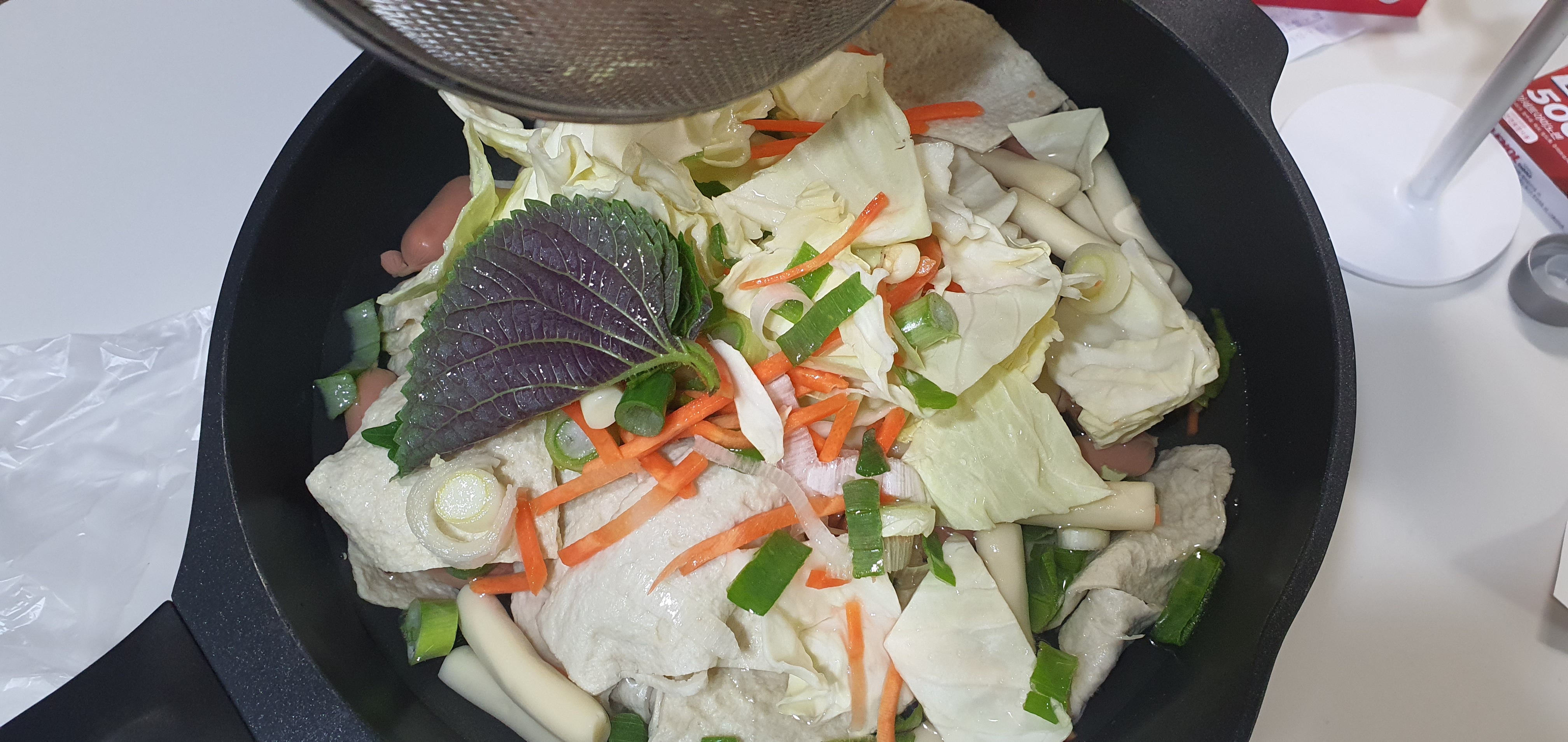 즉석떡볶이 재료중 떡류, 어묵, 비엔나소세지 등을 깊지 않은 편수 냄비에 담았습니다. 야채류는 세척되어 포장되어 있는데 조리 설명서에 한번 더 씻는 것으로 안내되어 있습니다. 이때 위 우측 사진과 같이 청양고추가 하나 들어가 있는데 소스 넣은후 맵기 조절용으로 활용할 수 있습니다. 아이들과 함께 먹을 것이어서 청양고추는 넣지 않았습니다.