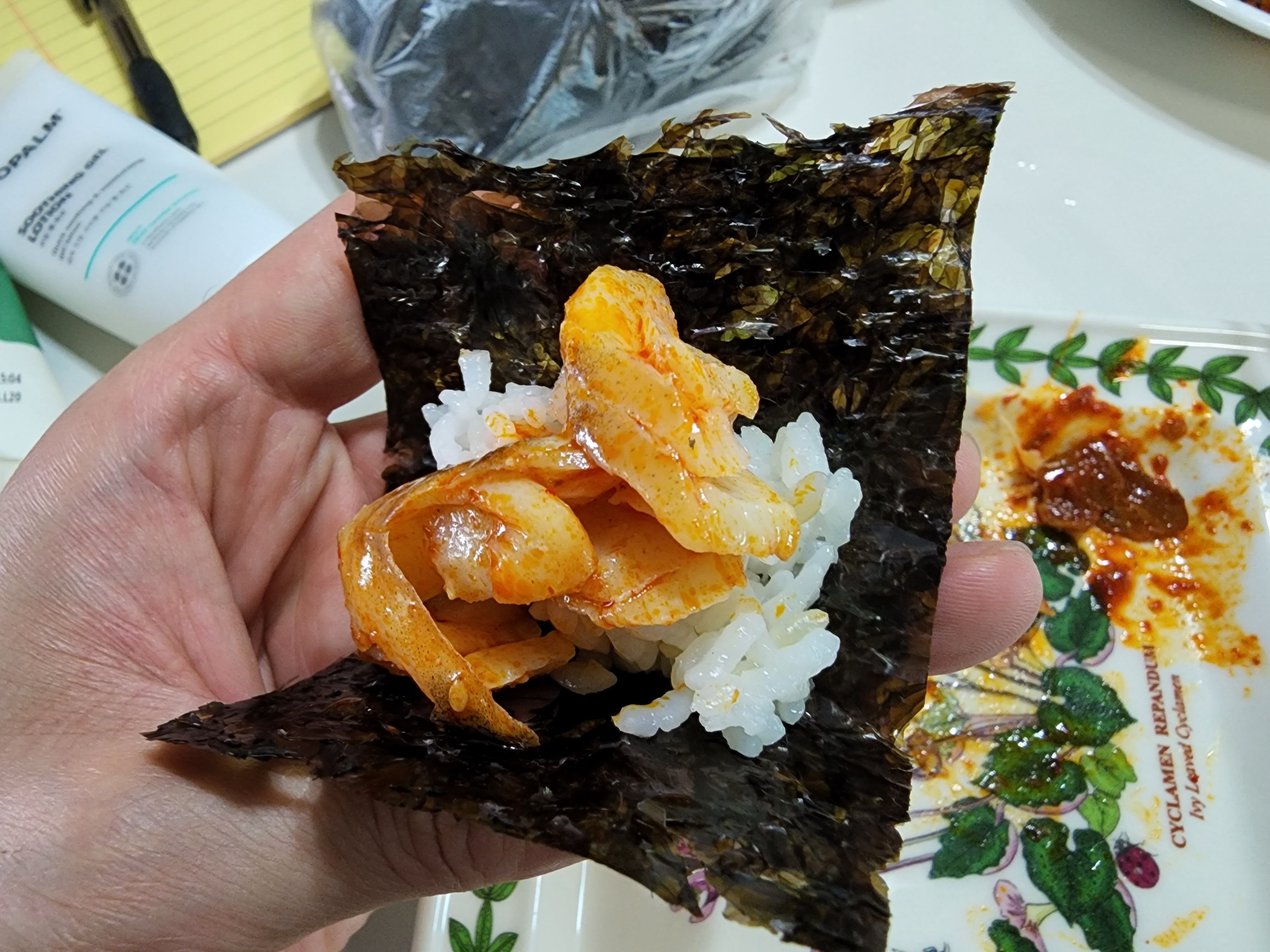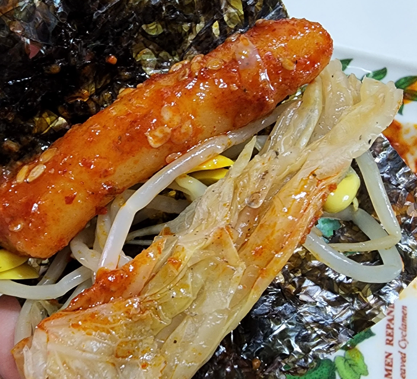 명태조림과 함께 포장된 기본찬은 깔끔하게 무친 콩나물과 묵은지를 씻어 잘린 것으로 보이는 명태조림용 쌈 김치입니다. 그리고 마른김 한 뭉치입니다. 루원시티 맛집 2대맛태는 김을 3인분 포장인데도 정말 넉넉하게 주시는 것 같습니다. 적게 주면 인심 없어 보이는데 넉넉하게 들어가 있어 기분 좋습니다.