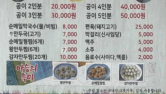 아승순메밀막국수 식당의 메뉴를 보면 다른 막국수집과 다릅니다. 인분 숫자 앞에 '공이'라는 단어가 붙어 있습니다. 이것이 메밀막국수를 뽑는 기계에 넣는 반죽 양을 얘기합니다. 가득 차게 넣어서 뽑는 것을 한공이라고 합니다. 예전에는 한공이 반공이 등으로 메뉴판이 되어 있었는데 인분수 기준으로 변경되었습니다.