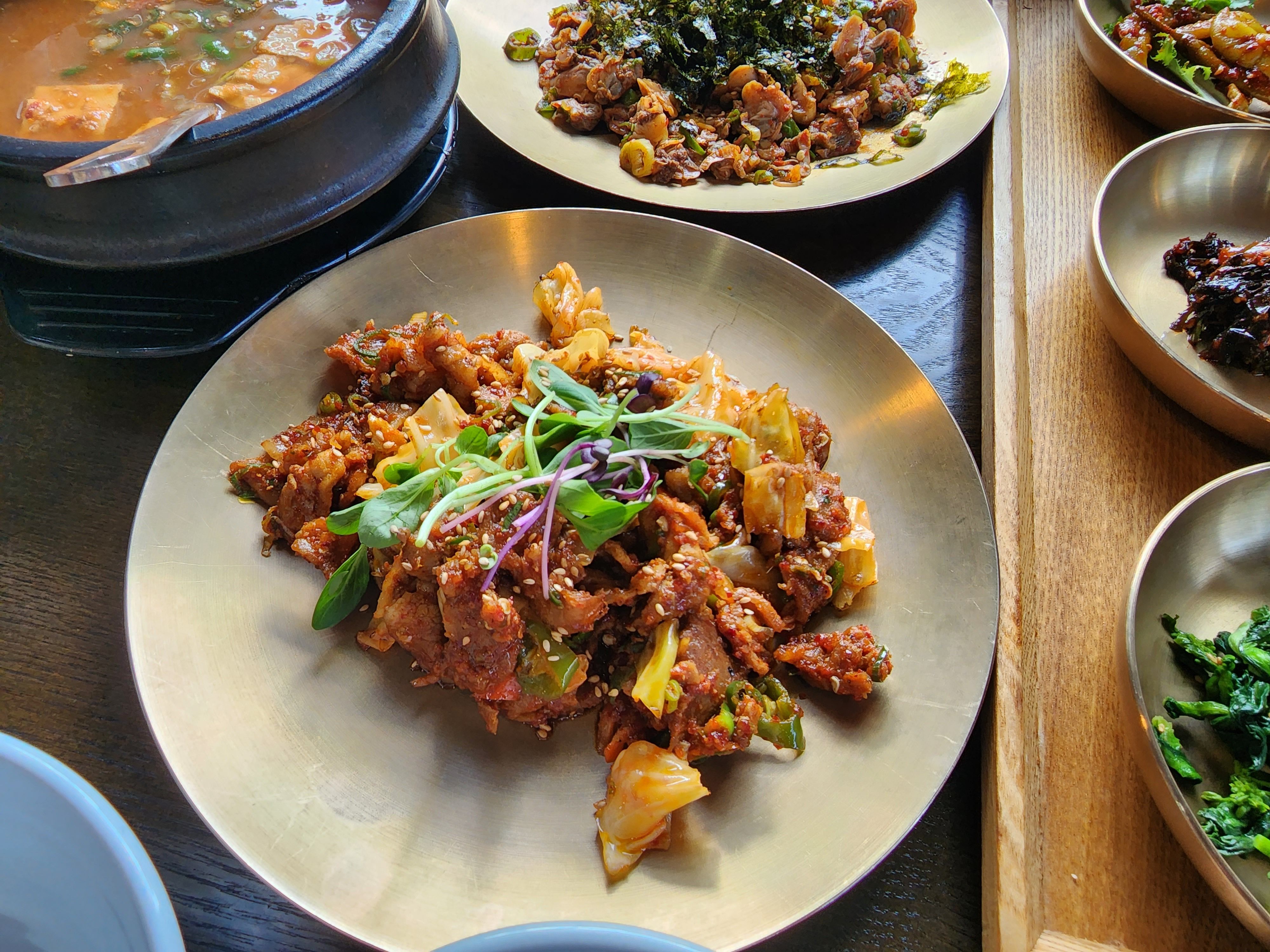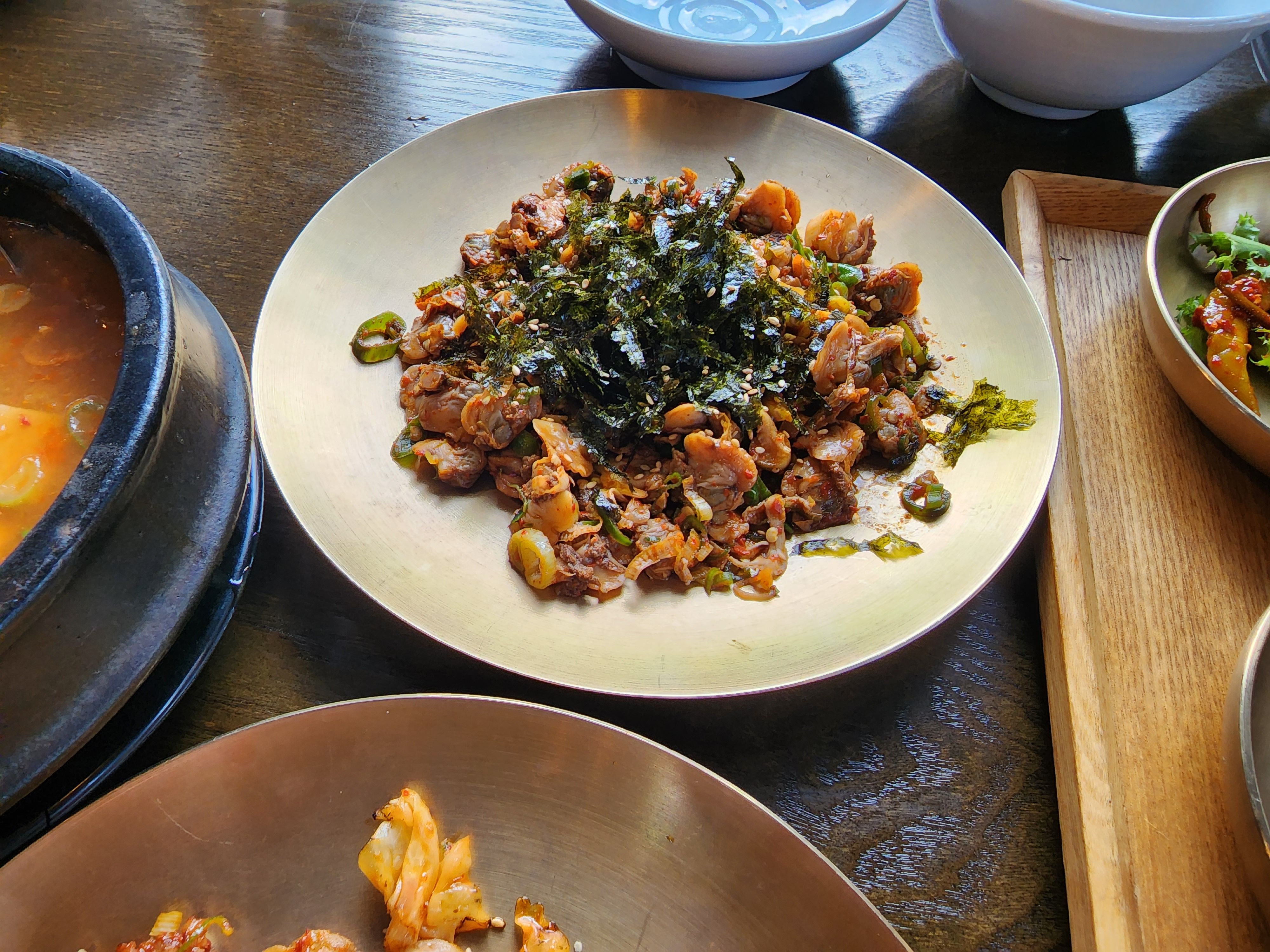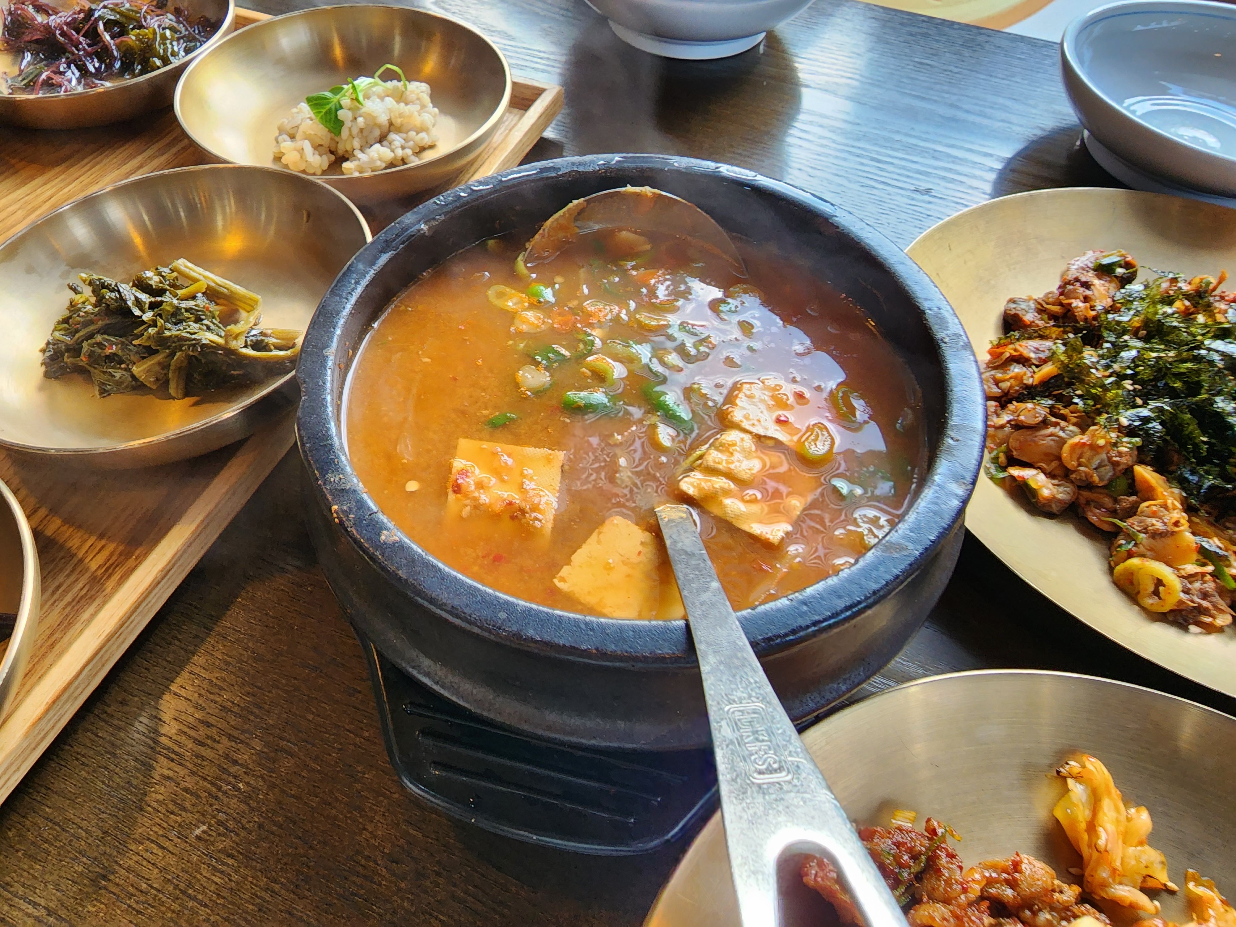 제가 주문하여 먹은 추가메뉴는 불범벅 제육과 꼬막무침입니다. 위 우측 사진 청국장은 인분수에 맞게 들밥을 주문하면 기본으로 포함된 메뉴입니다. 불범벅과 꼬막무침은 약간 양적으로 적은 듯한데 맛은 좋습니다. 불맛이 제대로인 제육과 간장 양념이 잘 스며든 꼬막무침 솥밥과 함께 먹기 정말 맛이 있습니다. 특히 청국장은 특유의 냄새 없이 깨끗한 맛이 납니다. 젊은 사람들도 좋아하는 청국장 맛으로 끓여 낸 것 같습니다. 텁텁함이나 잡내 없이 백반 국으로 먹기 아주 좋은 청국장입니다.