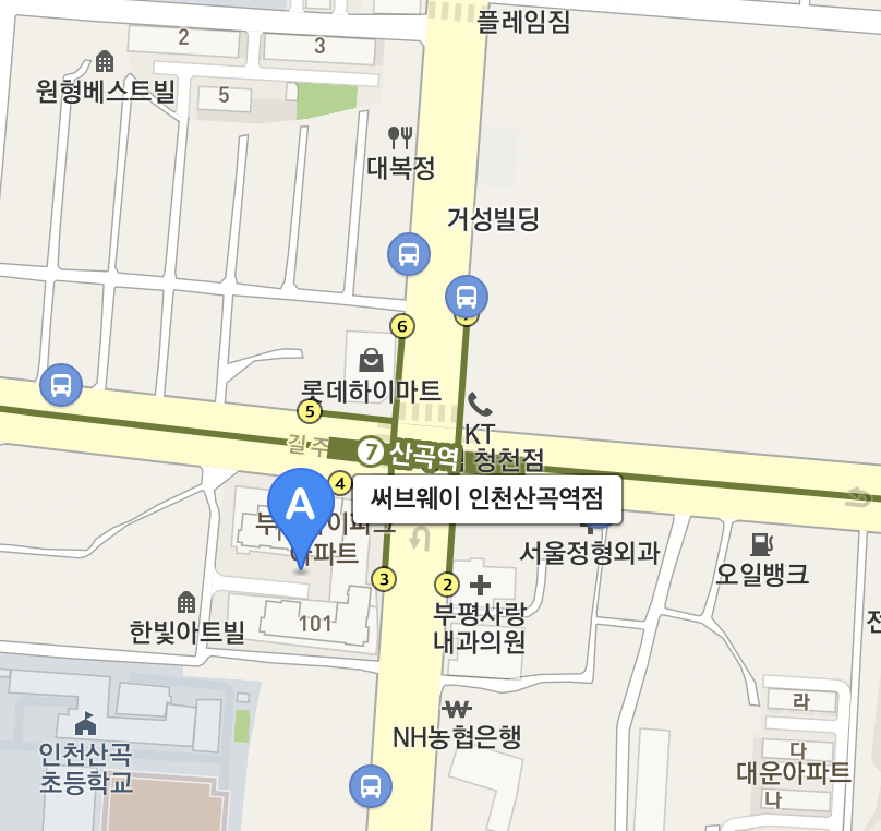7호선 산곡역이 개통되면서 아이파크 상가에 써브웨이가 입점되었습니다. 산곡역 근처에는 아직 이렇다 할 인프라가 없는 것 이 사실입니다. 산곡역 주변 상가에도 이용할 수 있는 좋은 매장들이 빨리 입점했으면 좋겠습니다.