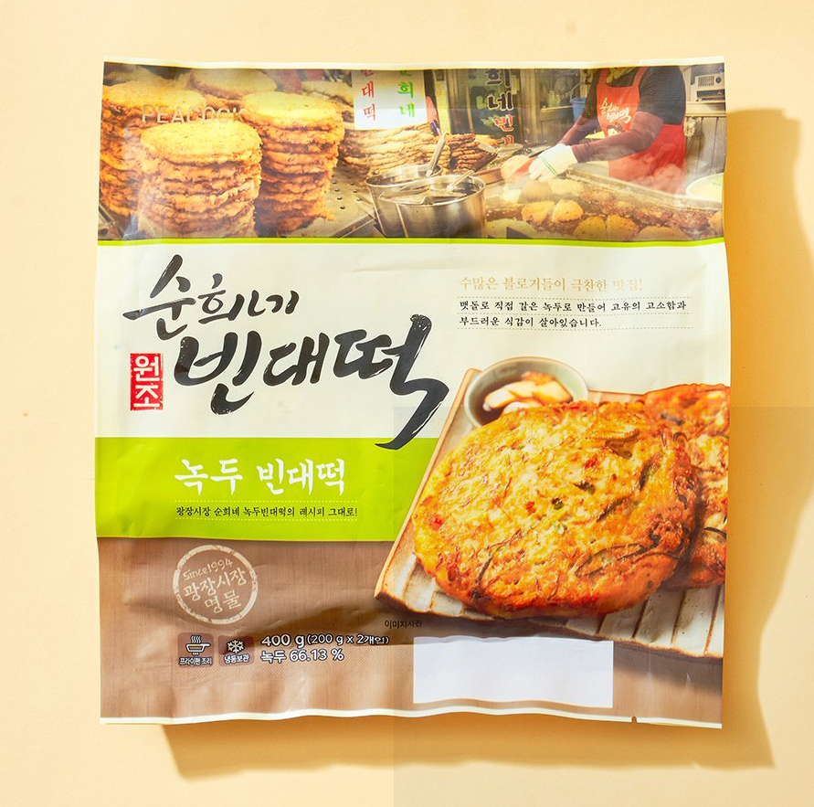 2. 순희네 빈대떡 : '순희네 빈대떡'은, 1994년 오픈해 광장시장 명물로 자리 잡았습니다. 한입 베어 물면 입 안 가득 녹두의 고소함이 전해집니다. 맷돌로 직접 녹두를 갈아 만들기 때문에 특유의 질감과 진한 고소함이 살아있습니다. 냉동 상품을 그대로 에어프라이어에 넣고 180도에서 10분간 구워주면 정말 담백하고 맛있는 빈대떡을 간편하게 즐기실 수 있습니다.