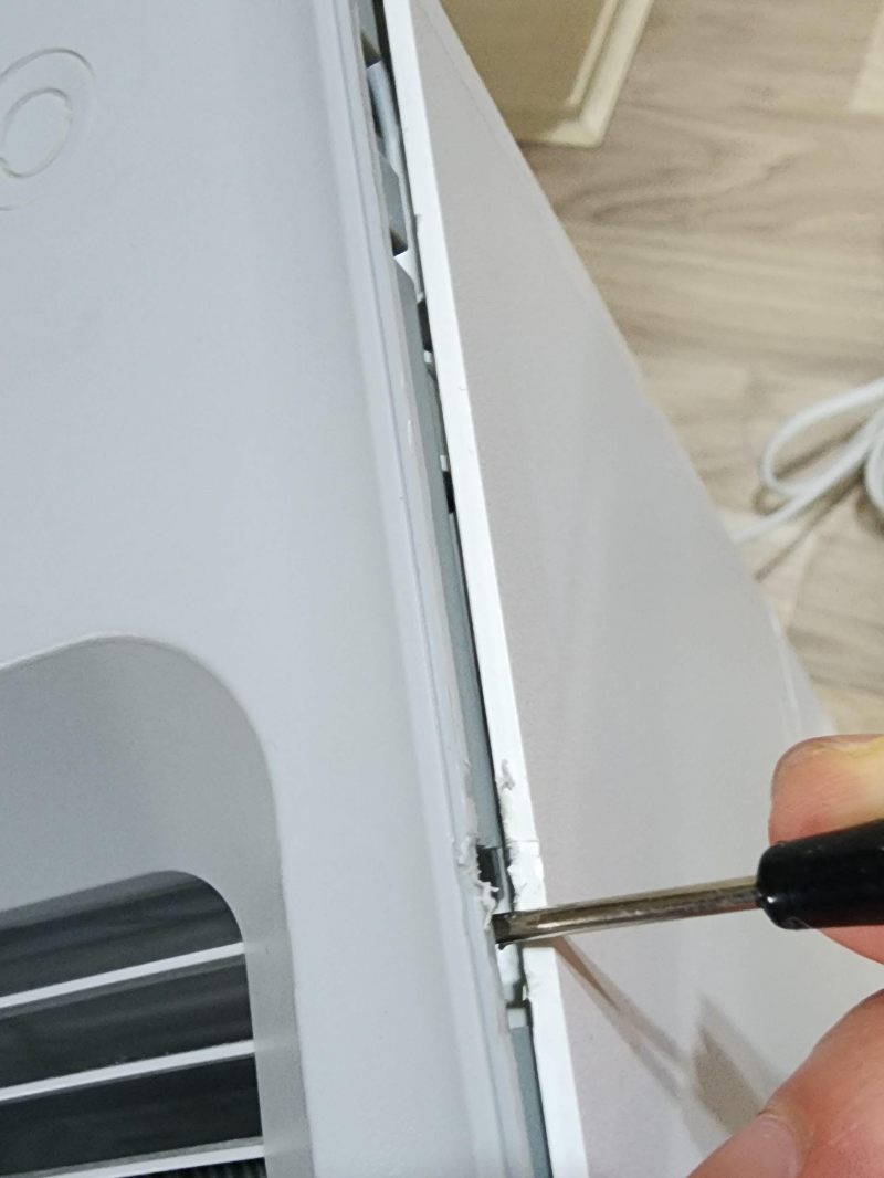 모터를 교체하기 위해서는 가습기 분해를 해야 합니다. 가정마다 위 좌측 사진처럼 얇은 일자 드라이버 하나쯤은 보유하고 계실 겁니다. 이것을 가습기 상단면 붙어있는 틈새 부분에 넣어서 지렛대 원리를 이용하여 걸어서 들어 올리면 됩니다. 이때 상단면 플라스틱 소재가 손상될 수 있습니다. 부러지지 않는 이상 작동에는 문제가 없습니다. 4면을 돌아가면서 조금씩 들어 올립니다.