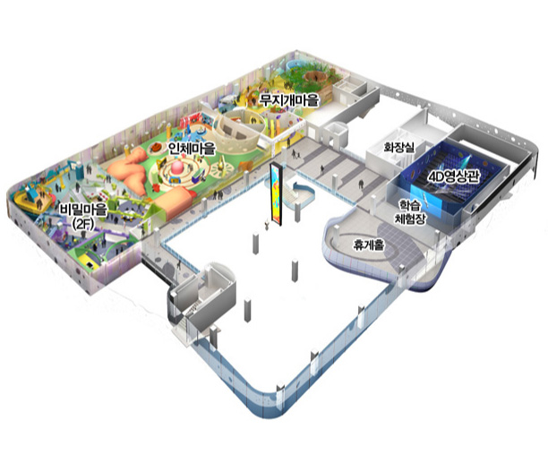 2층에는 비밀마을, 인체마을, 무지개마을, 4D영상관, 학습체험장, 휴게홀이 있으며, 3층에는 비밀마을, 지구마을, 도시마을, 산들바람 야외공연장, 그린실험실이 있으며, 지구마을은 11월 30일까지 신규 전시물 교체공사 중에 있습니다. 인천 가볼만한곳으로 층별 구성이 알차게 되어 있다는 느낌을 받았습니다.