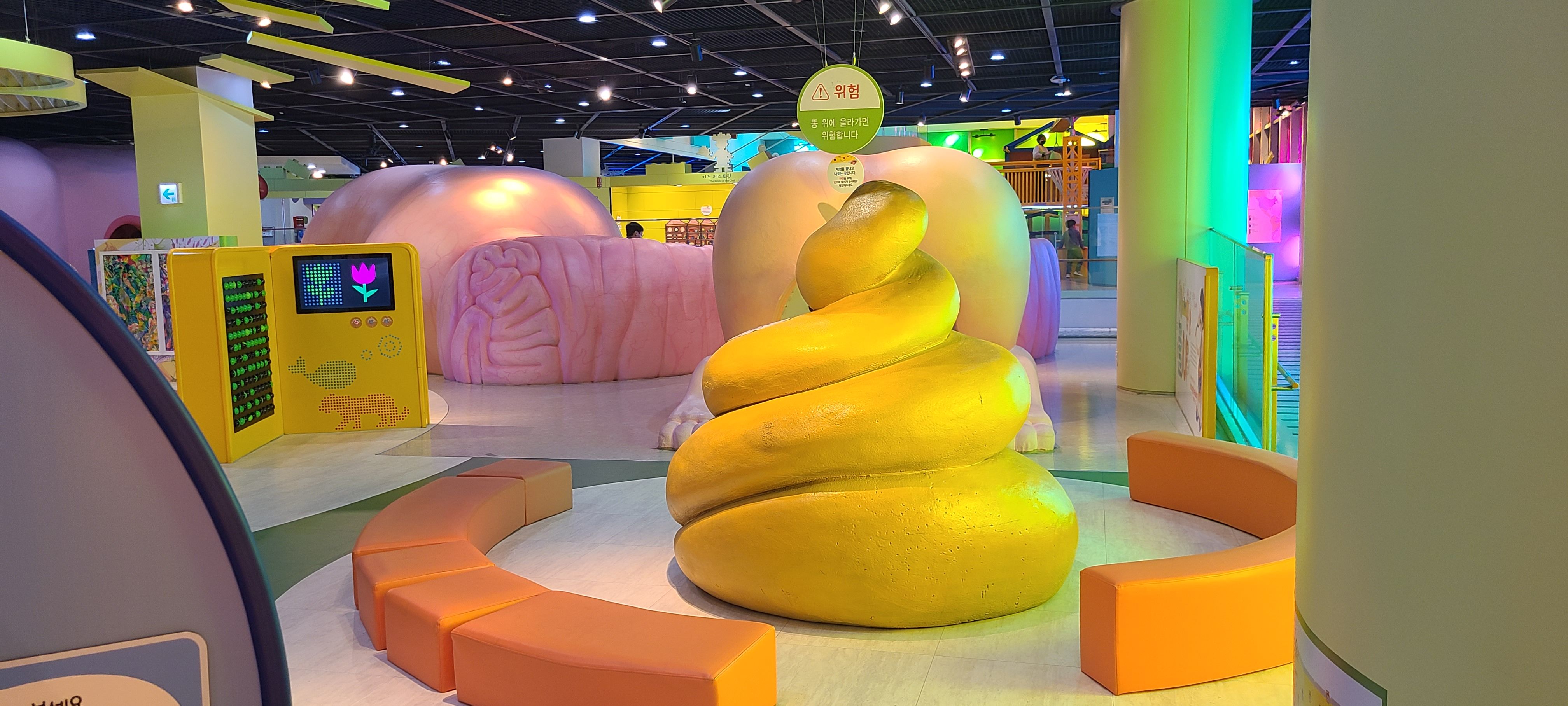 커다란 혀를 타고 입속으로 들어가 음식들과 함께 소화기관을 여행합니다. 입구에서 치카를 해 볼 수 있으며 소화기관인 위와 장을 지나면 마지막엔 똥이 뿌지직 나온다는 것을 표현하고 있습니다.