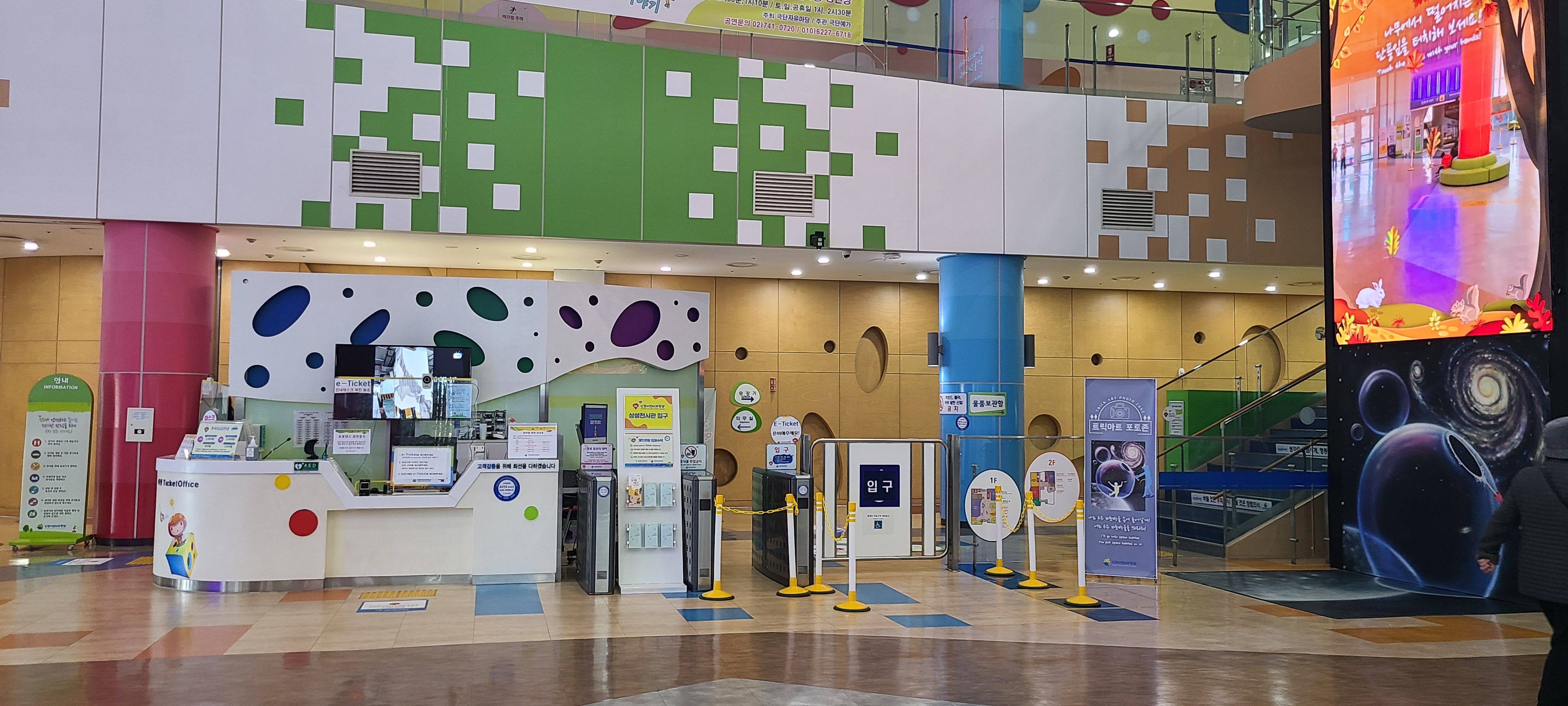 지하 주차장에서 올라오면 바로 안내데스크와 기획전시실, 카페테리아, 기념품판매점 등이 있습니다. 안내데스크에서 이티켓을 제시하고 입장하시면 됩니다. 카페테리아에서 커피와 간단한 빵 종류를 먹을 수 있습니다. 안내 데스크 오른쪽으로 대형 스크린이 설치되어 있는데 화면에 본인의 모습이 비칩니다. 아이들이 본인의 모습이 대형 스크린에 나오니 신기해합니다.