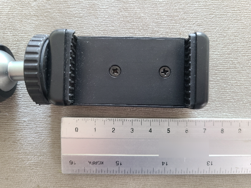 스마트폰 삼각대 부분에서 직접적으로 결합되는 폰클립 부분은 탄력적으로 고정되게끔 되어 있습니다. 당기지 않았을 때는 약 6.5센티 정도 됩니다. 최대 8.7센티까지 늘어 난다고 되어 있습니다. 위 우측 사진이 갤럭시 22 울트라를 정품 케이스가 장착된 상태에서도 쉽게 결합됩니다. 바형태 스마트폰에서 큰 사이즈인데도 어렵지 않게 결합되는 것 보면 시중 대부분 스마트폰은 결합이 가능할 것 같습니다.