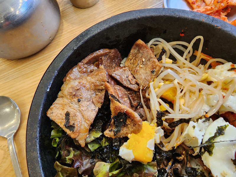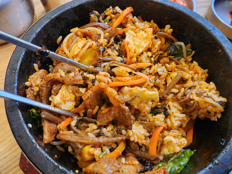 숯불고기는 위 좌측 사진과 같이 한 접시에 서빙됩니다. 돌솥비빔밥에도 숯불고기가 들어 있습니다. 비빔밥은 젓가락은 비벼야 잘 비벼집니다. 밥알이 뭉치지 않게 고슬고슬하게 식감좋게 비벼집니다. 따듯하고 매콤한 돌솥비빔밥 사람 많은 중심가에 나와서 먹으면 참 맛있습니다.