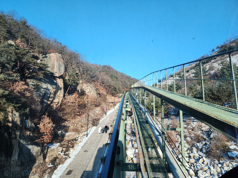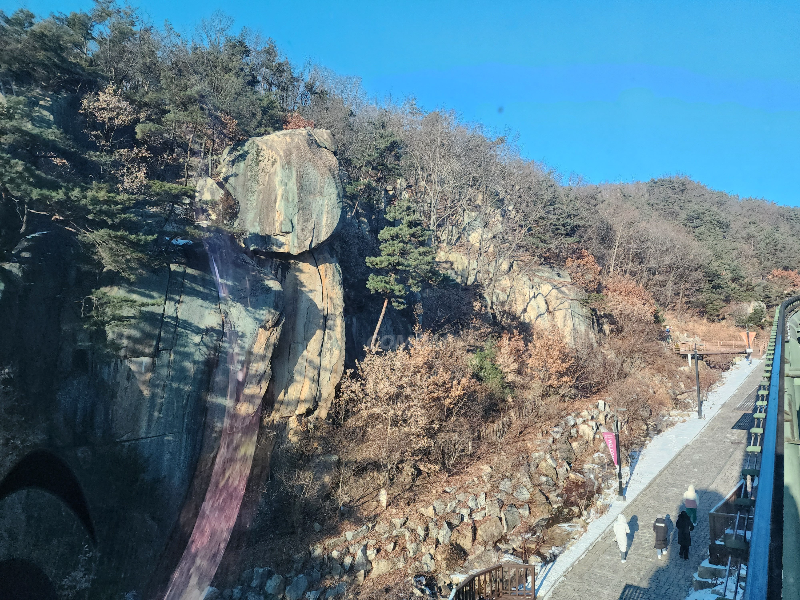 포천 가볼만한곳 아트밸리 모노레일은 경사진 곳을 오를 수 있게 2량으로 되어있습니다. 속도가 빠르지는 않지만 20미터는 되는 높이에서 주변 경관을 보는 재미가 나름 괜찮습니다. 조금만 밀면 떨어질 것 같은 바위도 볼 수 있습니다. 아래는 도보로 이동하는 방문객도 있는데 아마 아래에서는 위에서 보는 느낌과 다소 다를 것 같습니다.