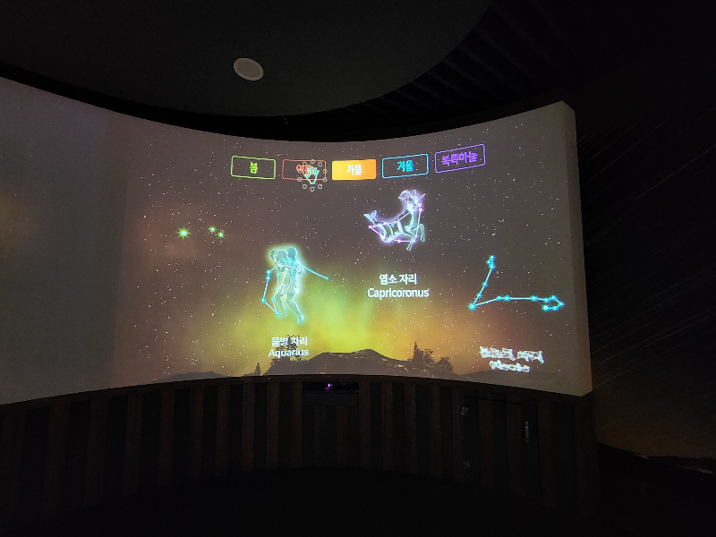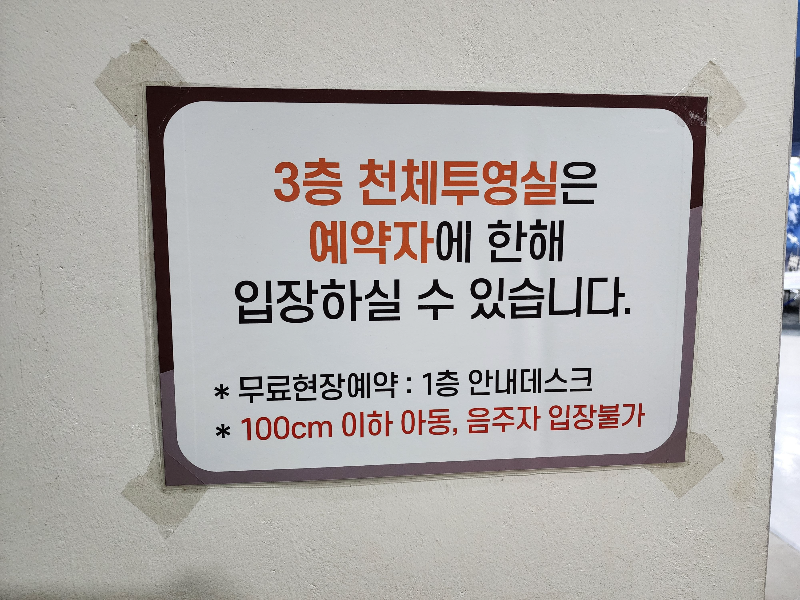 관람이 거의 마칠 즘에 3층 천체투영실 관람시간과 맞아떨어져 17시 30분 것을 1층 안내 데스크에 예약했습니다. 천체투영실 관람이 무료인데 이것 다른 곳에서는 돈 내고 볼만한 것입니다. 10분 동안은 천체에 관련된 영상과 나머지 10분은 4D 영상입니다. 화질이 조금 아쉽긴 했지만 몰입도는 상당히 괜찮았습니다. 저는 추운 겨울 비수기 관람객이 많지 않아 쉽게 예약을 하였는데 많을 때는 미리 방문하여 예약해야 될 것 같습니다. 위 관람시간 참고하여 이용하시면 되겠습니다.