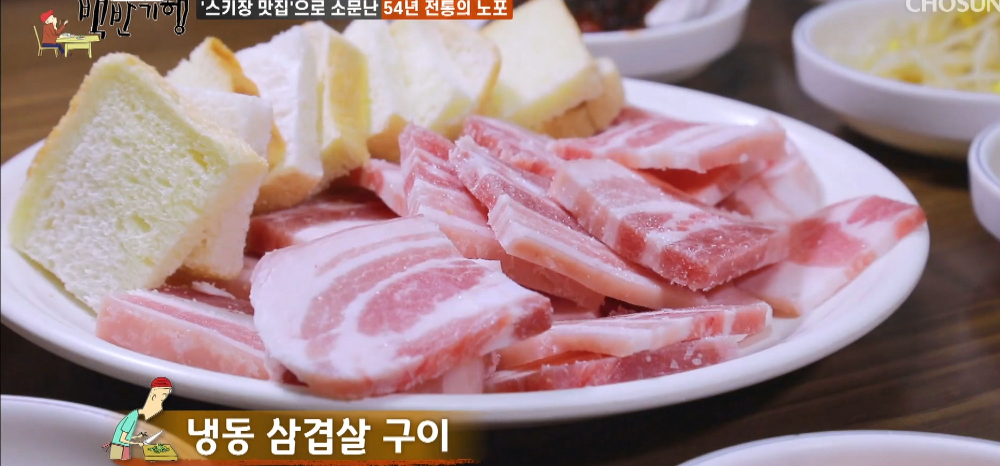 방송에서도 냉동 삼겹살 구이를 드셨습니다. 방송이라 그런지 삼겹살 접시 데코가 조금 남다릅니다. 식당 아주머니가 알려 주셔서 고기를 구울 때 식빵을 중앙에 놓아 기름을 제거했습니다. 냉동 삼겹이지만 이 식당이 일반적인 냉동 삼겹과 맛이 다른 이유가 싱싱한 생삼겹을 바로 냉동시킨다고 합니다.