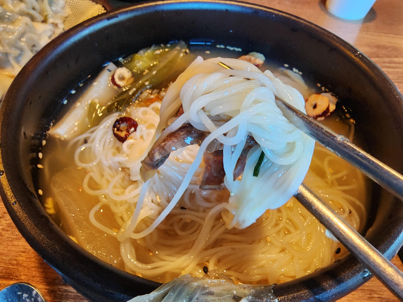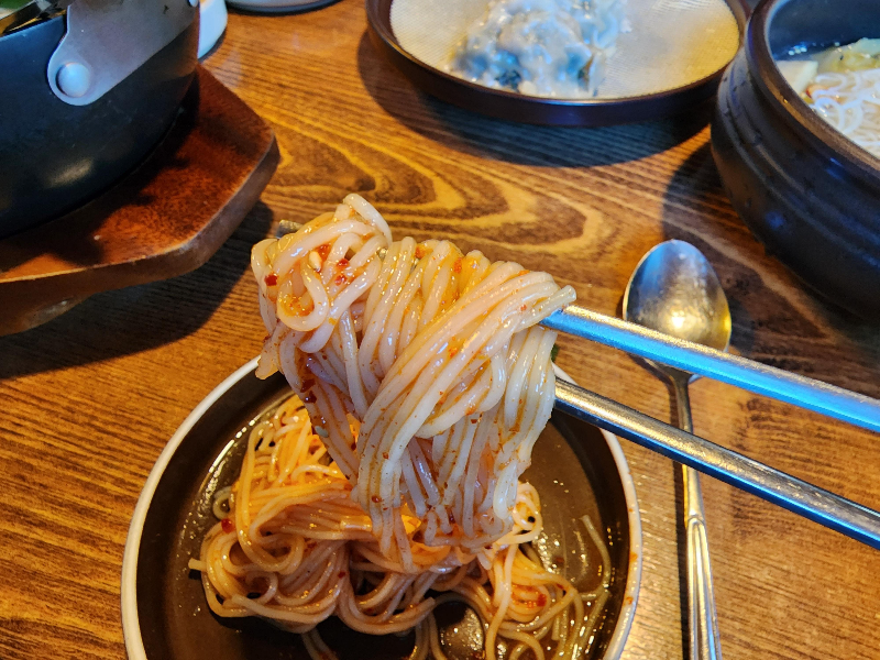 제가 먹어본 것은 동치미 국수인데 차가운 동치미 국물에 있어서 그런지 면발이 정말 탱탱했습니다. 식감좋게 고기도 들어가 있고 위 중앙 사진에 대추 말린 것이 고명으로 들어가 있는데 바삭한 게 먹는 재미도 있었습니다. 비빔국수도 맛 좀 보았는데 상큼하면서 매콤한 것이 정말 좋았습니다. 면 굵기가 소면이 아닌 약간 굵은 것이 중면을 사용하는 것 같기도 했습니다. 그래서 국수 식감도 좋으며 양도 푸짐한 느낌이 들었습니다.