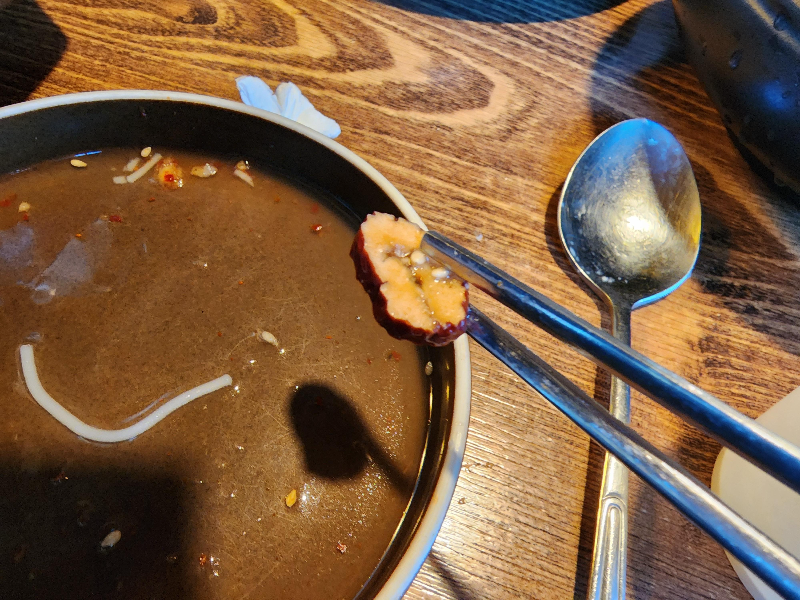 포천 맛집 국수집에 왔는데 만두를 빼놓을 수 없습니다. 만두는 딱 보아도 주문하여 조리한 것이 아닌 직접 만드는 만두인 것을 비주얼로 알 수 있습니다. 약간 못난이 만두 느낌인데 만두피가 약간은 두껍다는 느낌이지만 속은 정말 알차게 야채와 고기로 채워져 있습니다. 만두 크기는 왕만두보다 약간 작은 느낌입니다.