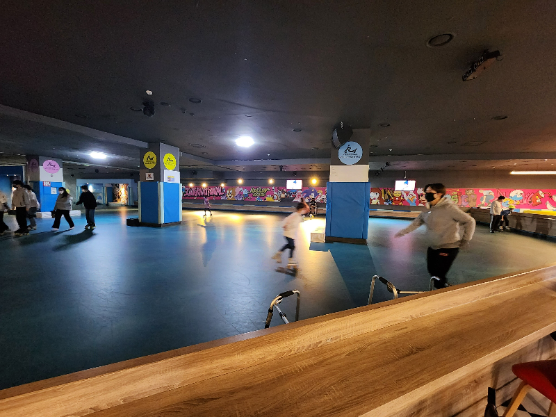 국제롤러장 사이즈는 실내라 그렇게 크다고 느껴 지지는 않지만 그렇다고 작게 느껴지지 않은 사이즈입니다. 매우 잘 타시는 분들이 스피드 있게 즐기는 공간은 아니지만 여유롭게 바닥에 롤링되어 부드럽게 미끄러지는 즐거움은 충분히 즐길 수 있습니다. 의자와 테이블이 많이 비치되어 있어 아이들과 함께 온 보호자 분들은 아이들이 시설을 즐기는 동안에 앉아서 휴식을 취할 수 있습니다. 롤러장 둘레에도 테이블과 의자가 비치되어 있어 아이들이 롤러 타는 모습을 볼 수 있습니다.
