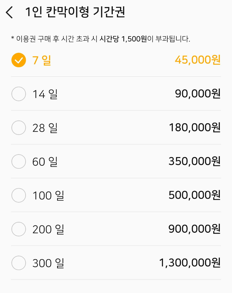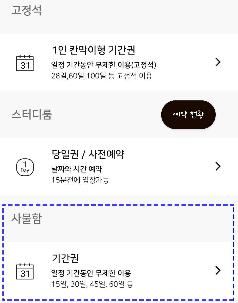 사용 일자별로 아니면 당일권은 사용 시간별로 요금이 달라집니다. 위 사진은 가장 비싼 칸막이형 기간권입니다. 저는 방문할때 마다 당일권을 시간단위로 결제하여 이용했습니다.