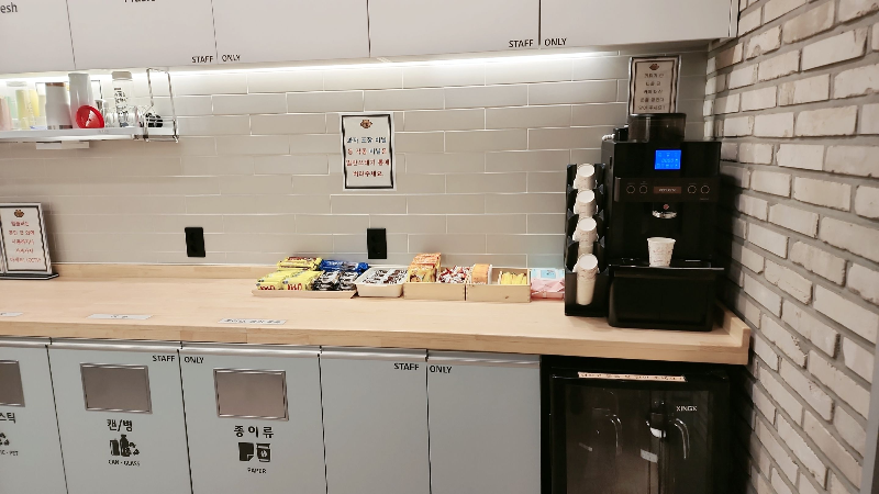 공부하기 좋은 조용하고 아늑한 분위기도 좋지만 마음에 드는 것이 간단하게 차와 과자를 먹을 수 있는 휴게공간입니다. 원두커피와 다양한 차와 아래 냉장고에는 음료도 보관되어 있어 먹고싶은 만큼 마실 수 있습니다. 과자도 항상 정렬되어 5 ~ 6가지가 있어 커피와 함께 먹기 정말 좋습니다. 공부하다 보면 약간 출출할 때가 있는데 정말 좋습니다.