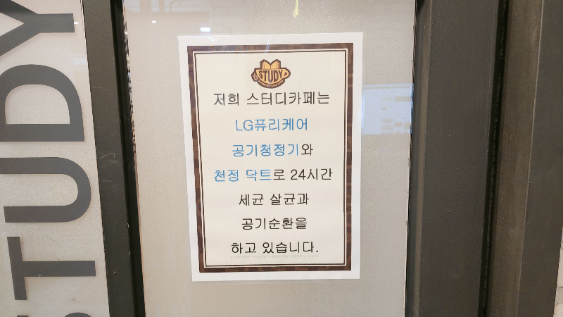인천청천점 스터디카페 시너지플레이스에는 스탠드형 LG 퓨리케어 공기 청정기와 천정 시스템으로 으로 공기 순환과 살균이 되어 공기가 항상 상쾌합니다. 머리를 많이 쓰는데는 깨끗한 공기가 중요한데 항상 깨끗한 공기가 공급되도록 시스템이 갖춰져 있어 좋았습니다. 당연히 청소도 잘 되어 있어 먼지도 전혀 없습니다.
