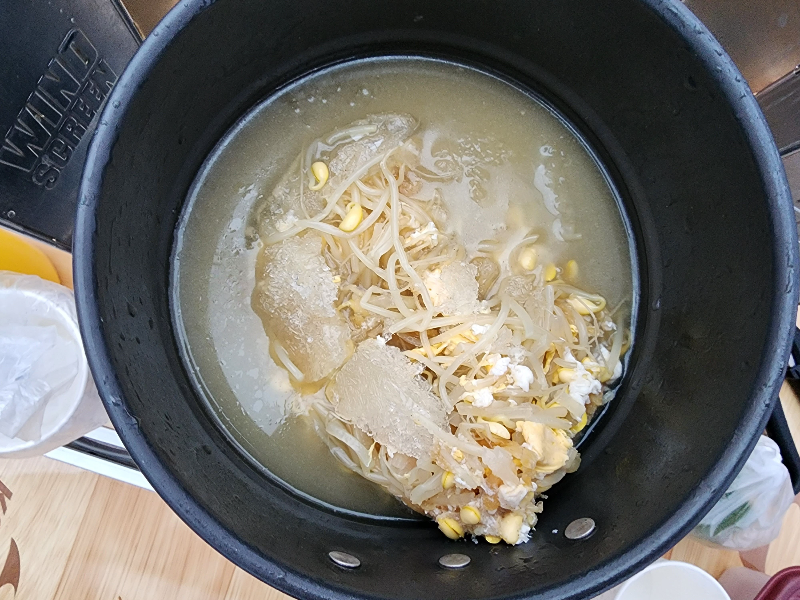 극한의 동계 캠핑에서는 요리하는 것이 쉽지 않습니다. 그래서 간편하게 요리할 수 있는 간편식을 구입하거나 준비하여 가는 것이 좋습니다. 저는 트레이더스에서 꼬치어묵을 동계캠핑 준비물로 챙겨 갔습니다. 물만 붓고 꼬치어묵과 함께 들어간 소스를 넣어 끓여주면 됩니다. 그리고 명태콩나물국, 된장찌개 등도 집에서 준비하여 가니 식사 준비하는 것이 한결 편했습니다.