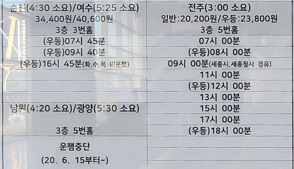 순천과 여수도 1일 2 ~ 3회 운행하고 있으며 전주는 생각보다 운행 횟수가 많습니다. 세종을 경유하는 횟수를 포함하면 하루에 9회를 운행하고 있어 선택의 폭이 넓습니다.