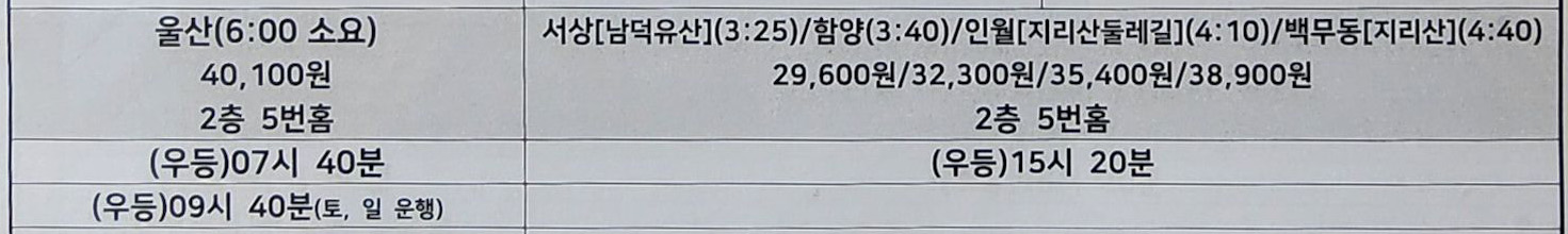 울산도 우등버스로 하루에 2번만 운행하고 서상, 함양, 인월, 백무동 지역은 덕유산과 지리산이 있는 관광지역이라 하루에 한번 운행하고 있습니다.