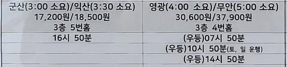 전라북도에 위치한 군산과 익산은 하루 1회만 운행하며 영광과 무안은 1일 2 ~ 3회 운행하고 있습니다. 경상권과 전라권은 부천버스터미널에서 운행 지역이 그렇게 많지 않습니다. 있더라도 완행으로 운행하는 지역이 많습니다. 없는 지역은 인천버스터미널을 이용하면 되겠습니다.