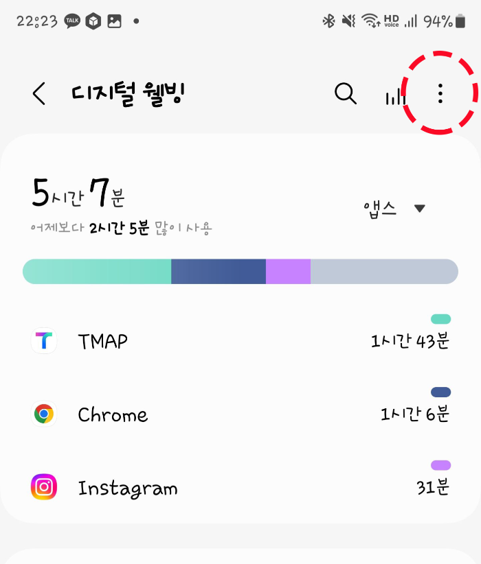 메뉴 아래를 보면 메뉴에 대한 설명으로 '사용시간'이라는 표시가 있습니다. 이 메뉴를 선택하면 아래 그림과 같이 디지털 웰빙이라는 제목으로 하루동안 스마트폰 사용시간을 확인할 수 있습니다. 가장 많이 사용한 앱순으로 내림차순으로 정렬되어 나타납니다.