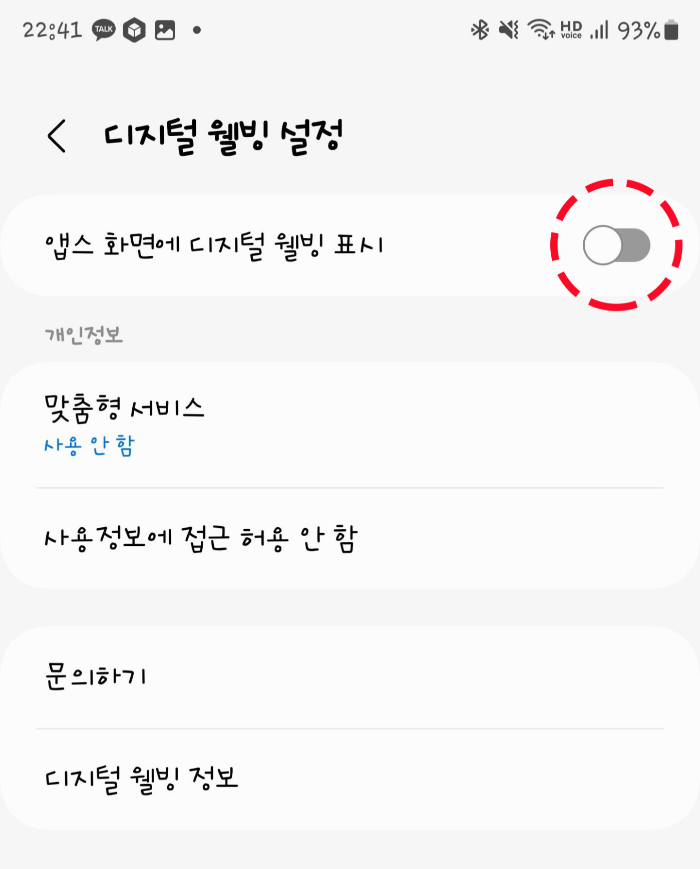 '앱스 화면에 디지털 웰빙 표시'라는 우측 메뉴 옆에 버튼이 활성화 되어 있지 않습니다. 버튼을 한번 터치하면 색이 변하면서 아래 그림과 같이 변화됩니다.