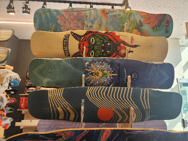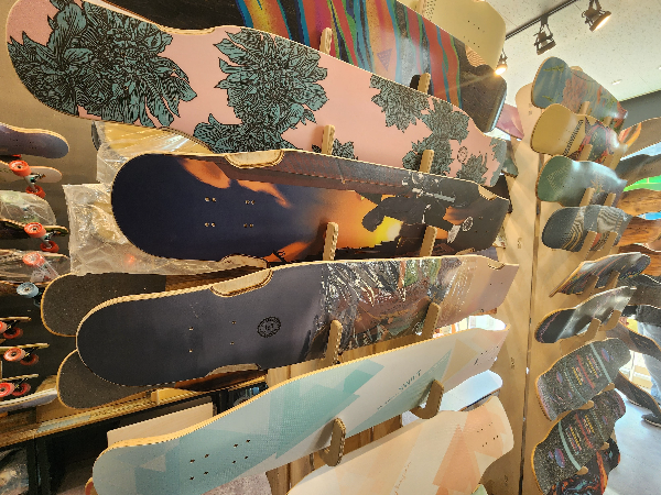 롱보드가 학생이나 젊은 사람들이 많이들 애용하는 액티비티한 스포츠입니다. 그래서 보드 아래 무늬가 굉장히 다양합니다. 파스텔 톤의 심플하게 페인팅된 것도 있지만 작품이라고 여겨질 만한 그림이 프린팅된 보드판도 있습니다.