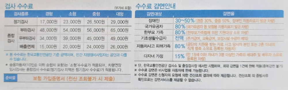 자동차 검사 비용은 정기검사의 경우 경자동차는 17,000원이며 대형은 29,000원입니다. 종합검사는 검사 내용에 따라서 비용이 정기검사에 비해 1.5배에서 2배정도 비쌉니다. 그리고 검사 비용 할인은 장애인은 30 ~ 50%, 국가유공자 80%, 다자녀 가정 15% 등이 해당되면 챙겨서 꼭 할인 혜택을 받으시기 바랍니다.