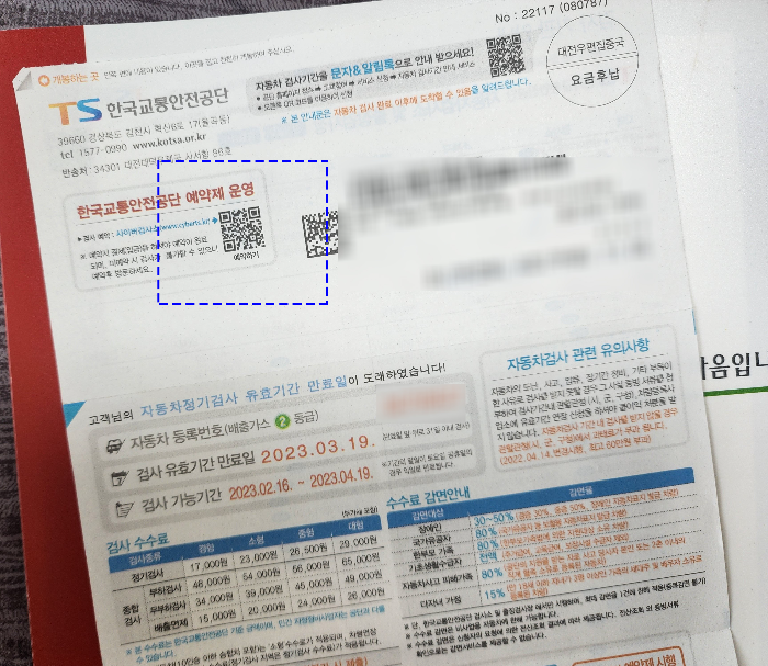 자동차검사를 예약하는 방법은 한국교통안전공단에서 받은 안내서에 QR코드가 있습니다. 위 사진 좌측 상단 QR코드로 안내되는 사이트로 사이버 검사소에 들어가서 편리하게 예약하면 됩니다.