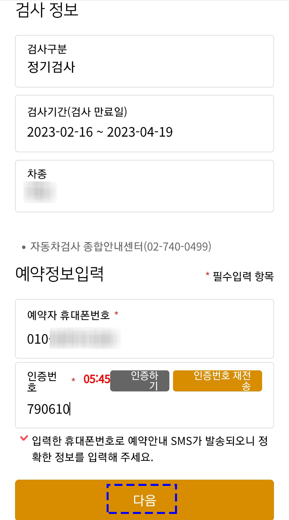 차량 조회를 누르면 검사 예약이 가능한지 확인하는 과정을 거칩니다. 검사 가능 차량이면 위 중앙 사진과 같이 검사기간과 차종 나타나며 아래는 예약자 휴대폰 번호를 입력한 후 인증을 하면 되겠습니다. 그리고 난 후에 검사를 받고 싶은 일자를 선택하면 되겠습니다.