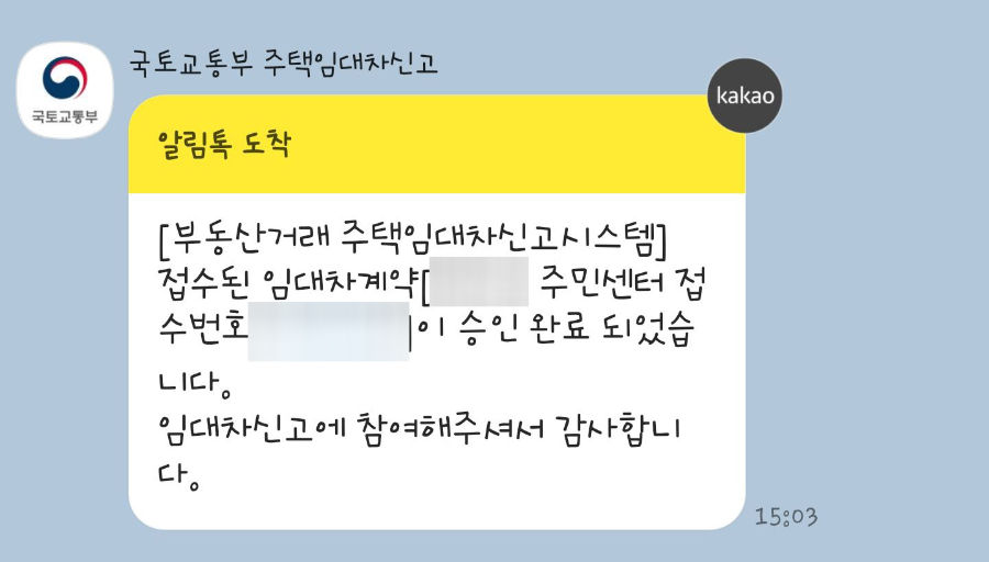 주민센터에 전월세 신고를 완료하면 국토교통부 알림톡으로 주택임대차신고 메시지가 바로 도착합니다. 온라인으로 하였을 때도 동일하게 옵니다.
