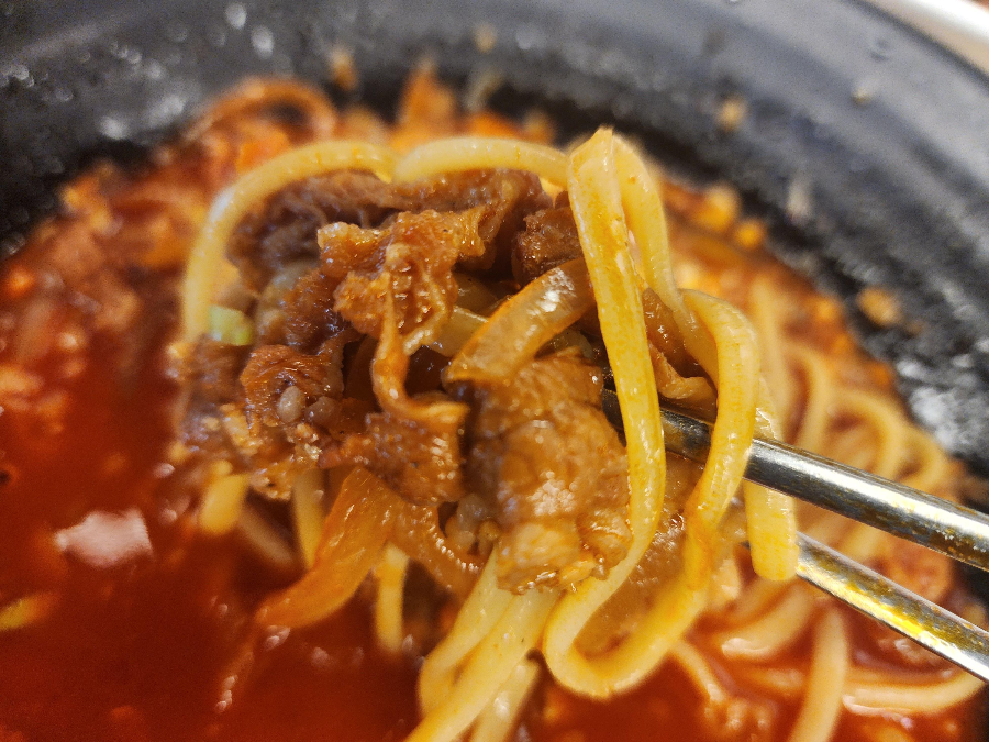 제가 주문한 음식은 우삼겹 짬뽕입니다. 처음에는 국물이 굉장히 새 빨개서 그런지 너무 매운 것이 아닌가 생각했습니다. 그리고 표면적으로 면보다는 고기가 굉장히 많이 보입니다.